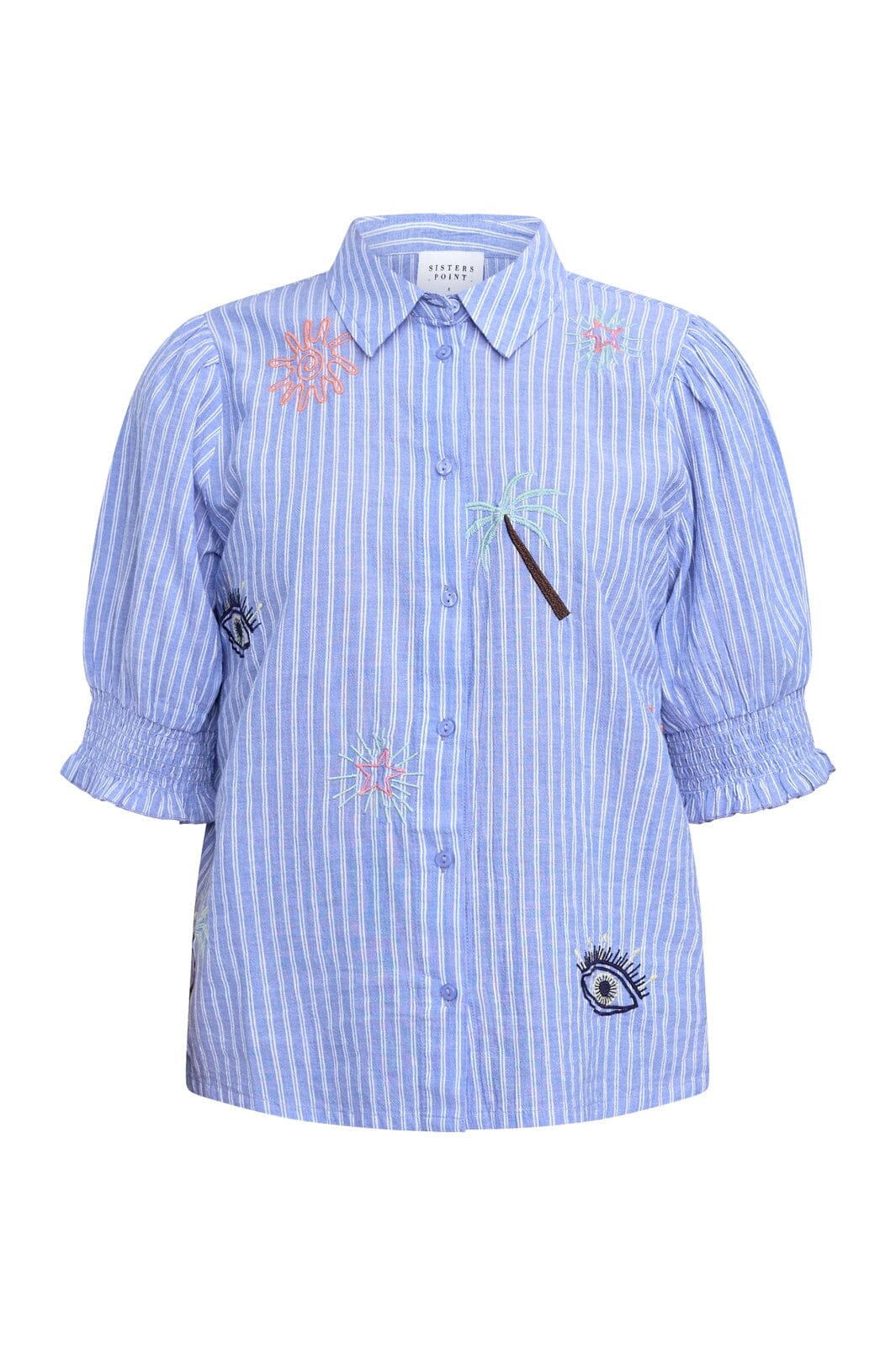 Stribet skjorte fra Sisters Point i blå og hvide striber. Den har broderede motiver af palmer og sole på forsiden.
