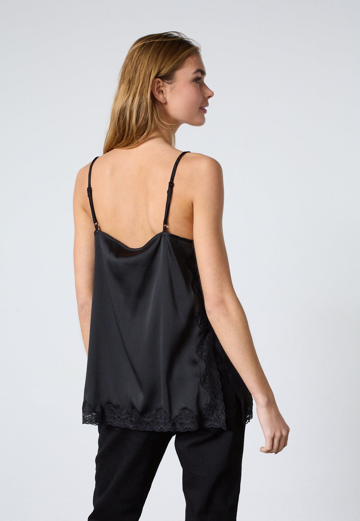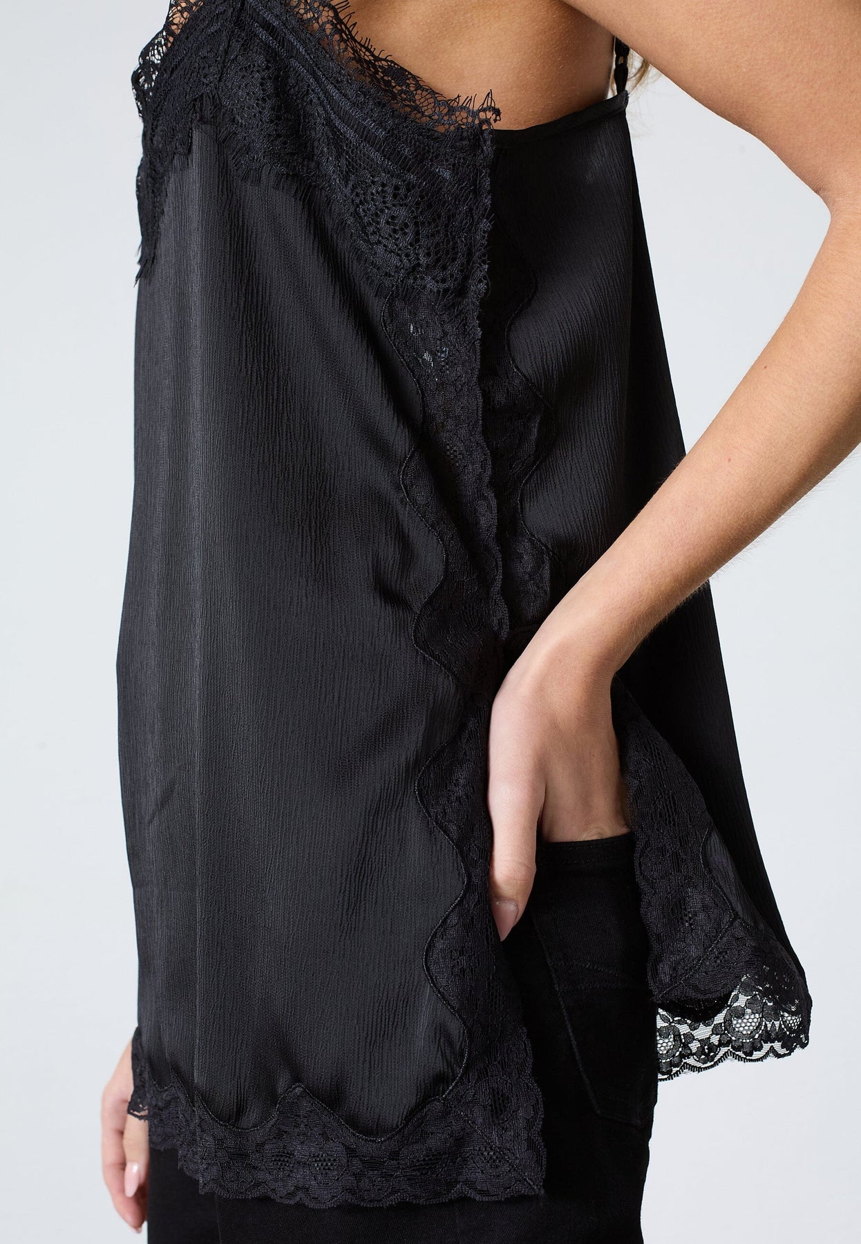 Sort top fra Sisters Point, lavet af satin med blondekanter. Toppen har tynde spaghettistropper og en V-udskæring med blonder.