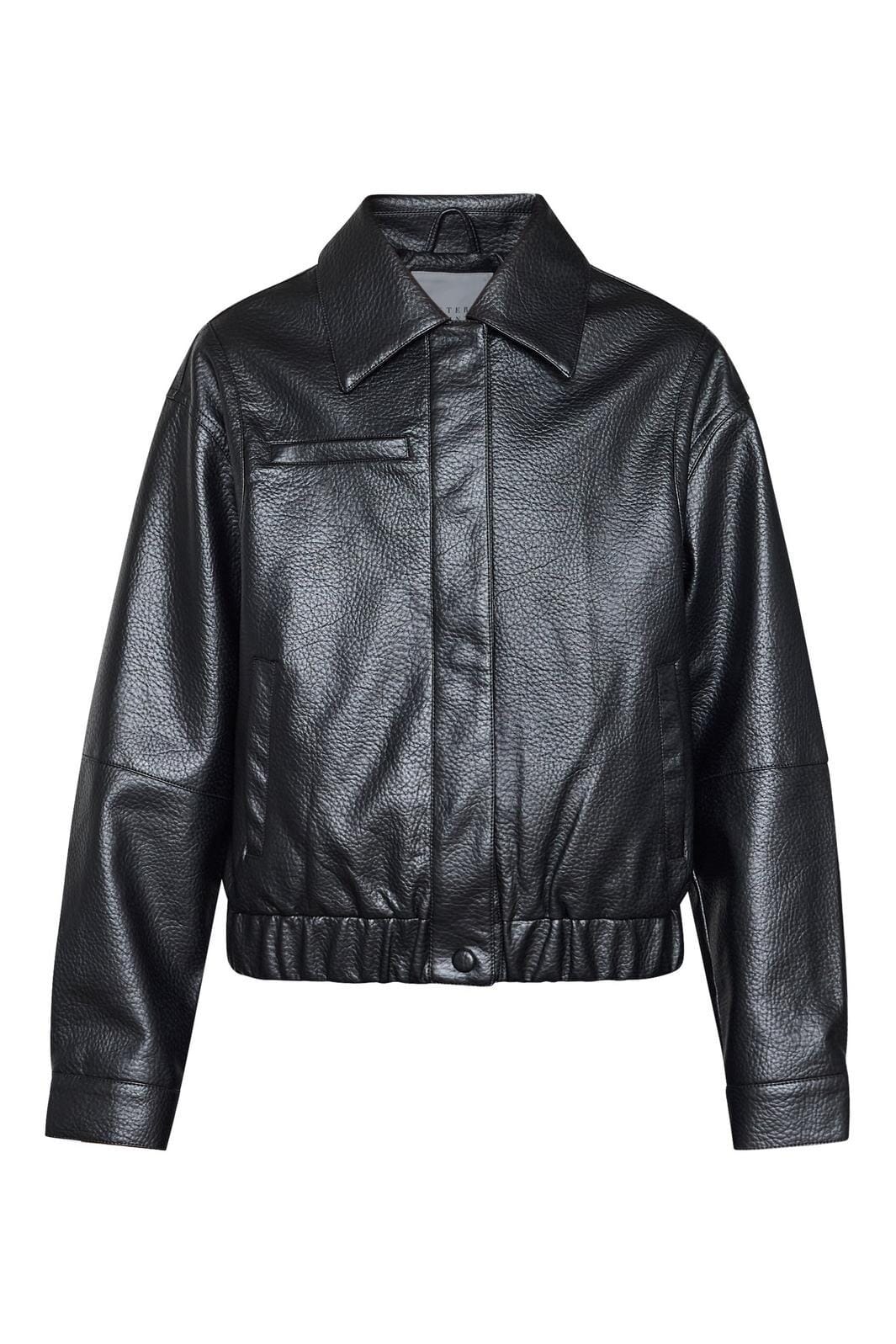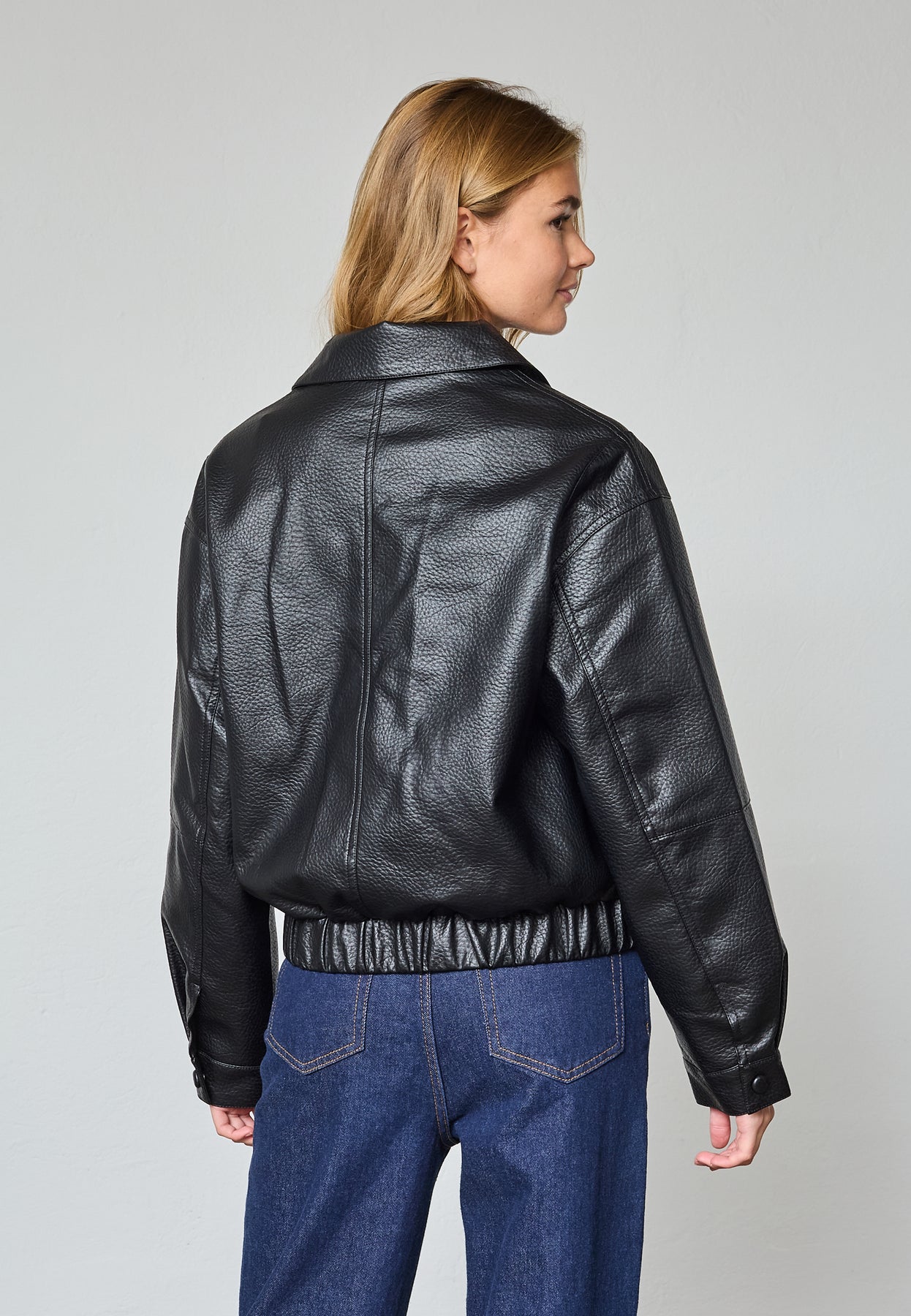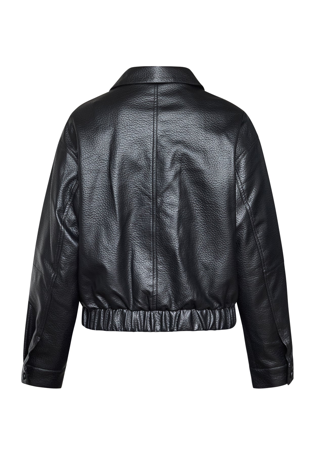 er en bomberjakke med læder-look. Jakken har en klassisk krave, knaplukning og elastisk ribkant i bunden. Den er designet med en kort, afslappet pasform og har sidelommer. Modellen har en str. S på.