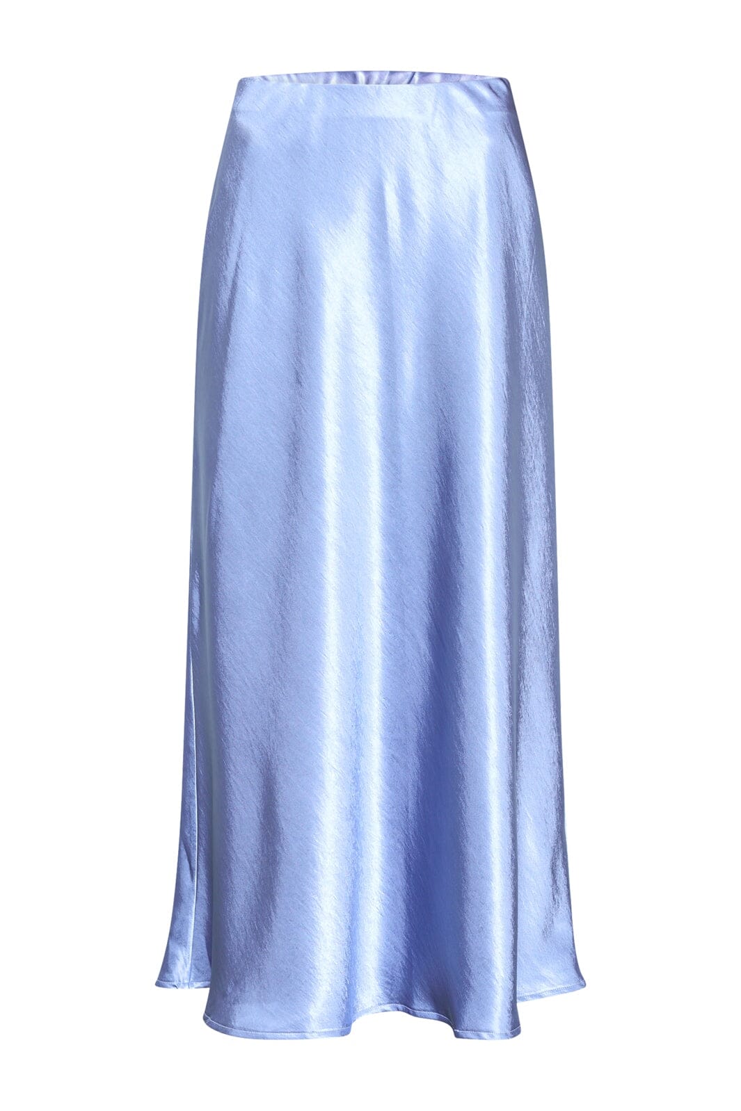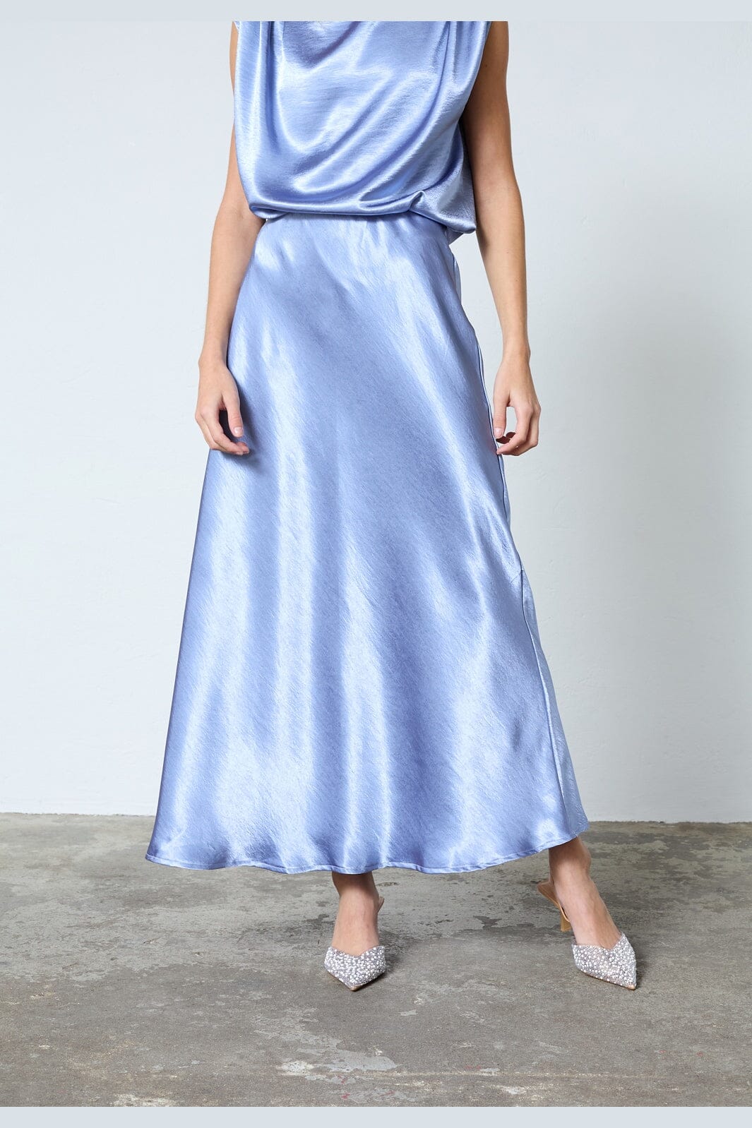 Midtblå nederdel fra Sisters Point, lavet af satin med et A-formet snit. Nederdelen har en skinnende overflade og går til læggen.