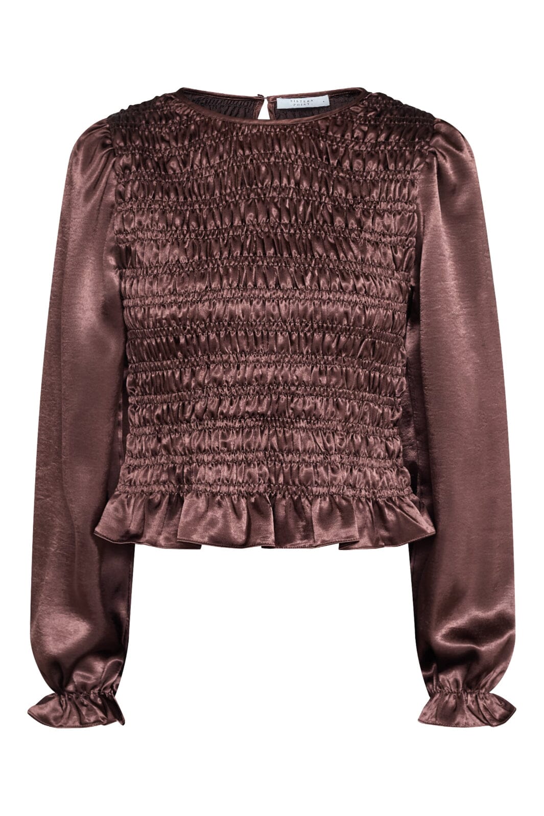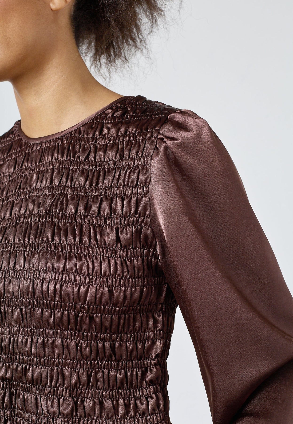 Brun bluse fra Sisters Point, lavet af satinmateriale. Blusen har rund halsudskæring, lange ærmer med let puffet effekt og tæt smock over brystet og ryggen.