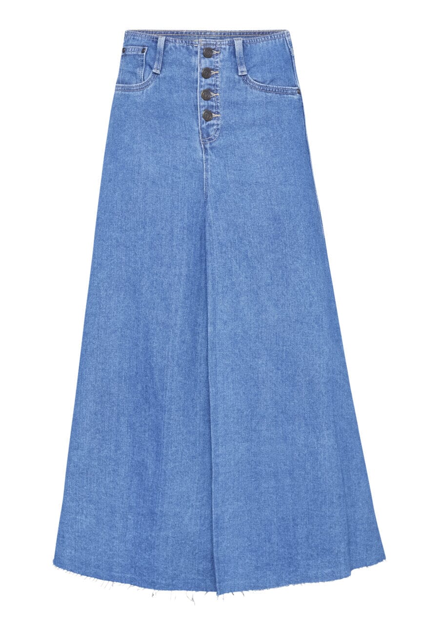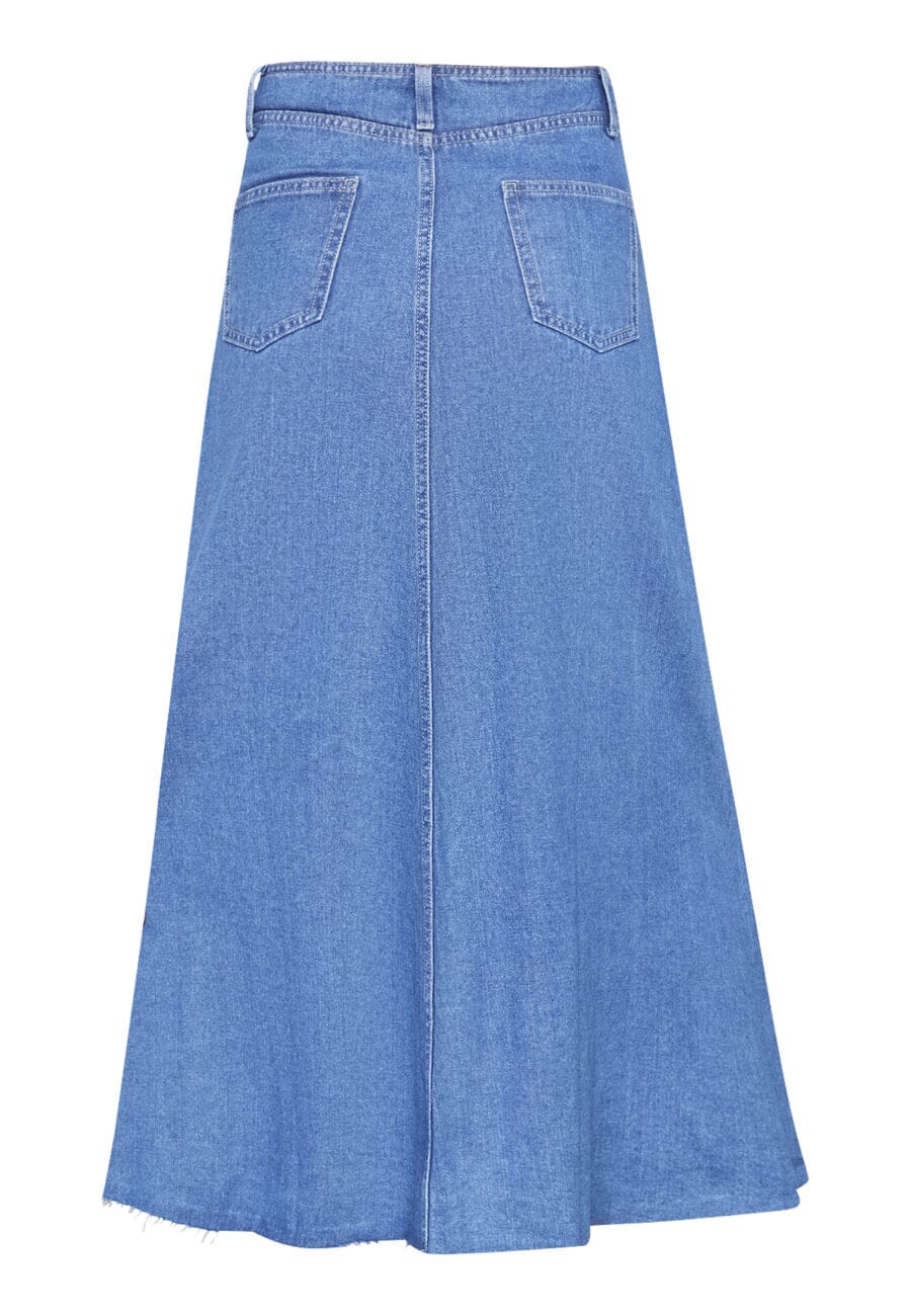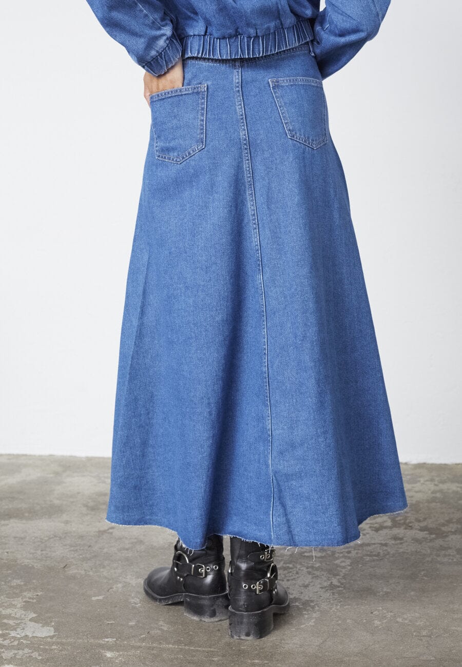 Midtblå denimnederdel fra Sisters Point, lavet af 100 % bomuld. Nederdelen har en høj talje og en ankel-længde med en let A-formet silhuet.