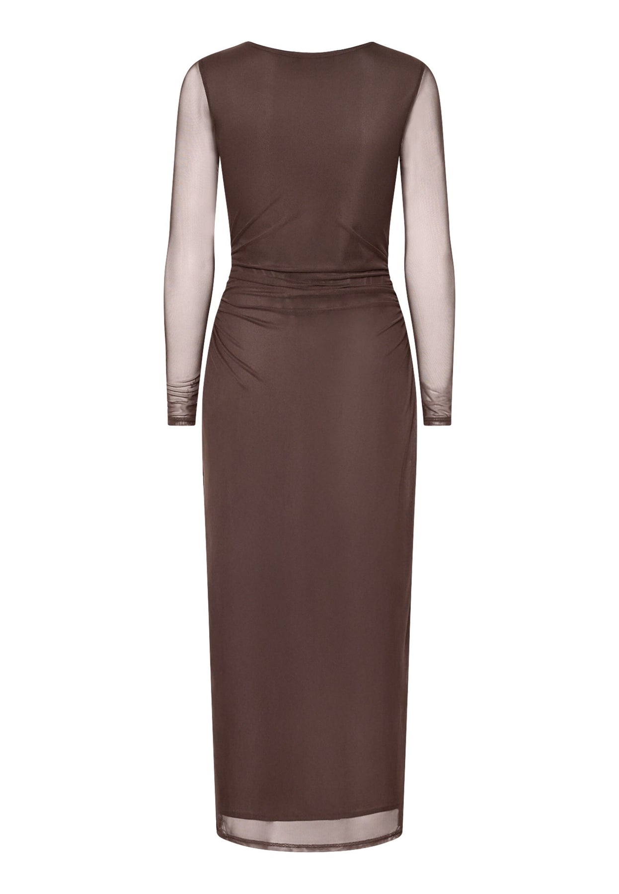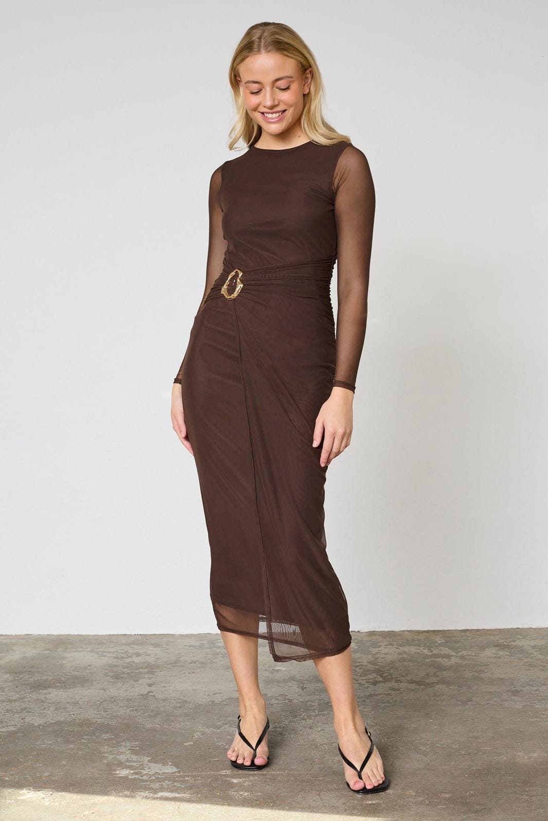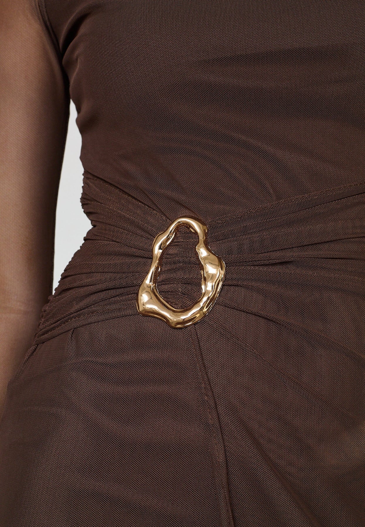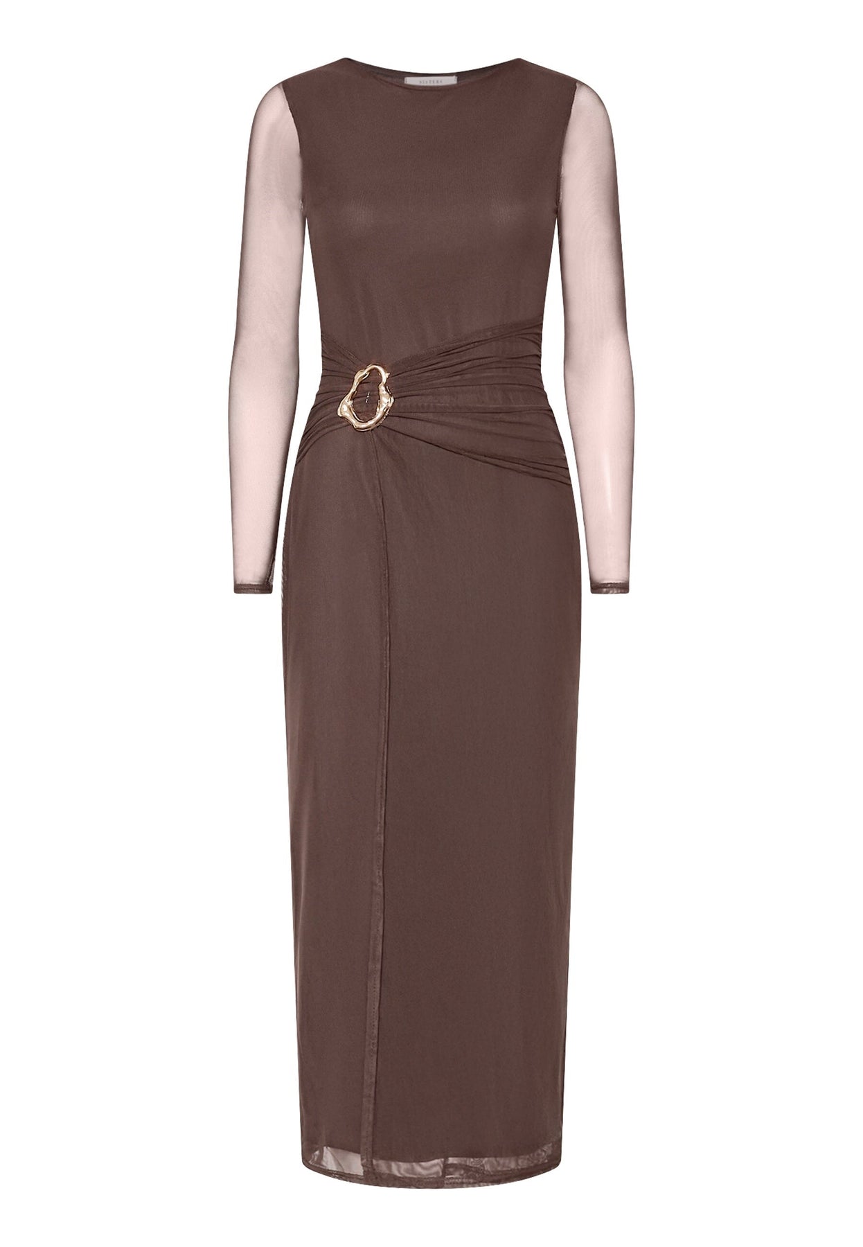 Brun kjole fra Sisters Point med lange gennemsigtige ærmer og guldfarvet spænde i taljen. Kjolen har en tætsiddende pasform og rund halsudskæring.
