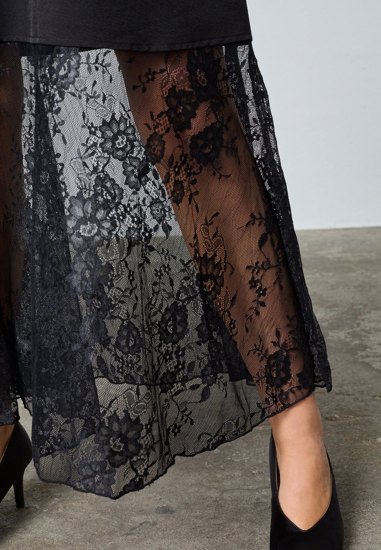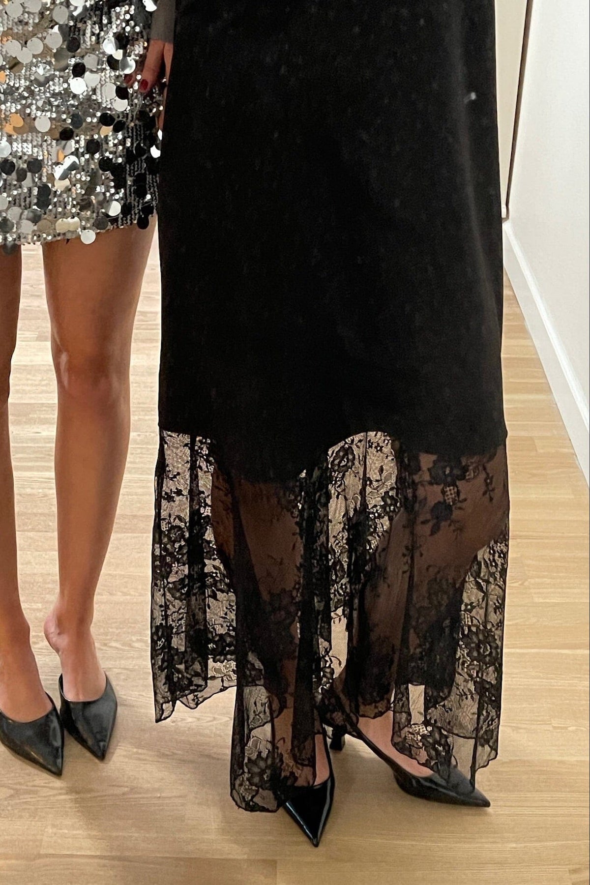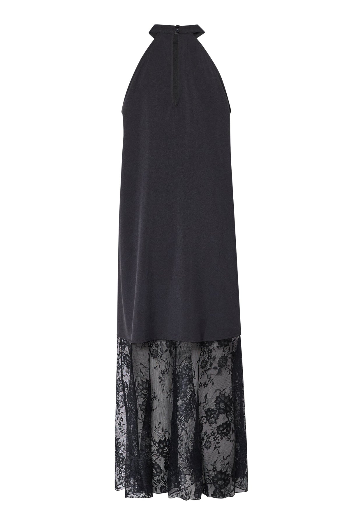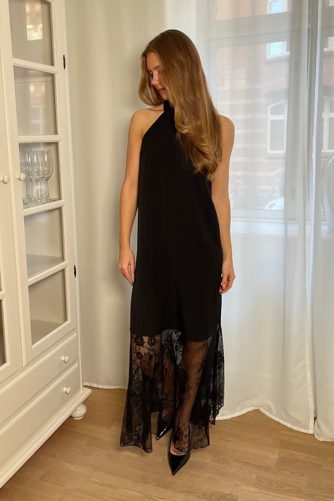 Sort ankellang kjole fra Sisters Point med høj halsudskæring. Den ærmeløse kjole har blonder i den nederste del og en løs pasform, der gør den velegnet til festlige anledninger.
