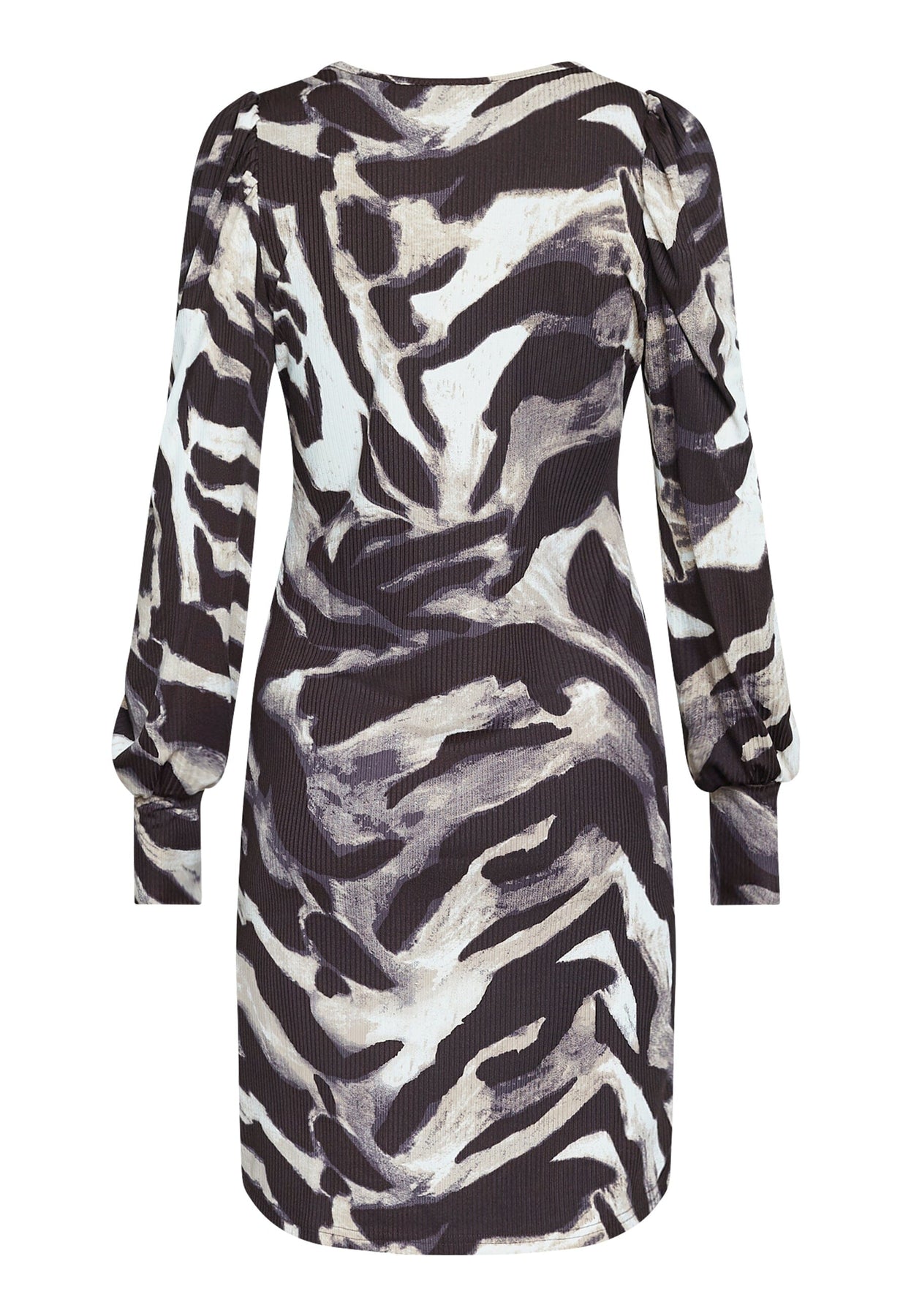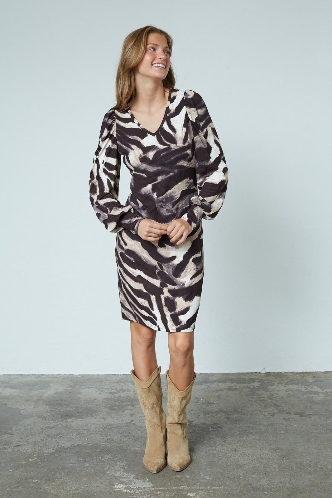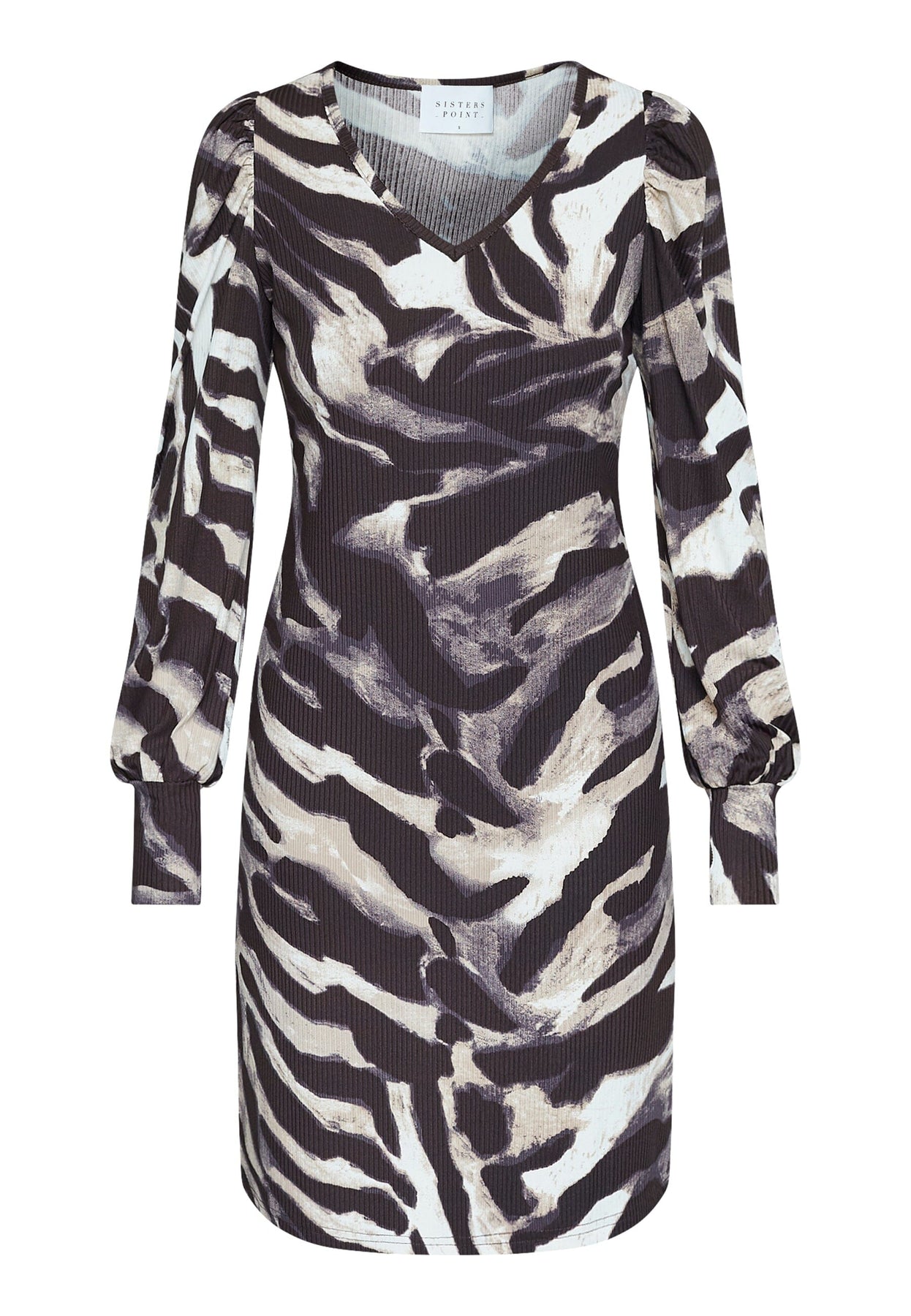 Knælang kjole fra Sisters Point i brune og beige toner med dyreprint. Kjolen har en tætsiddende pasform med V-udskæring og lange ærmer.
