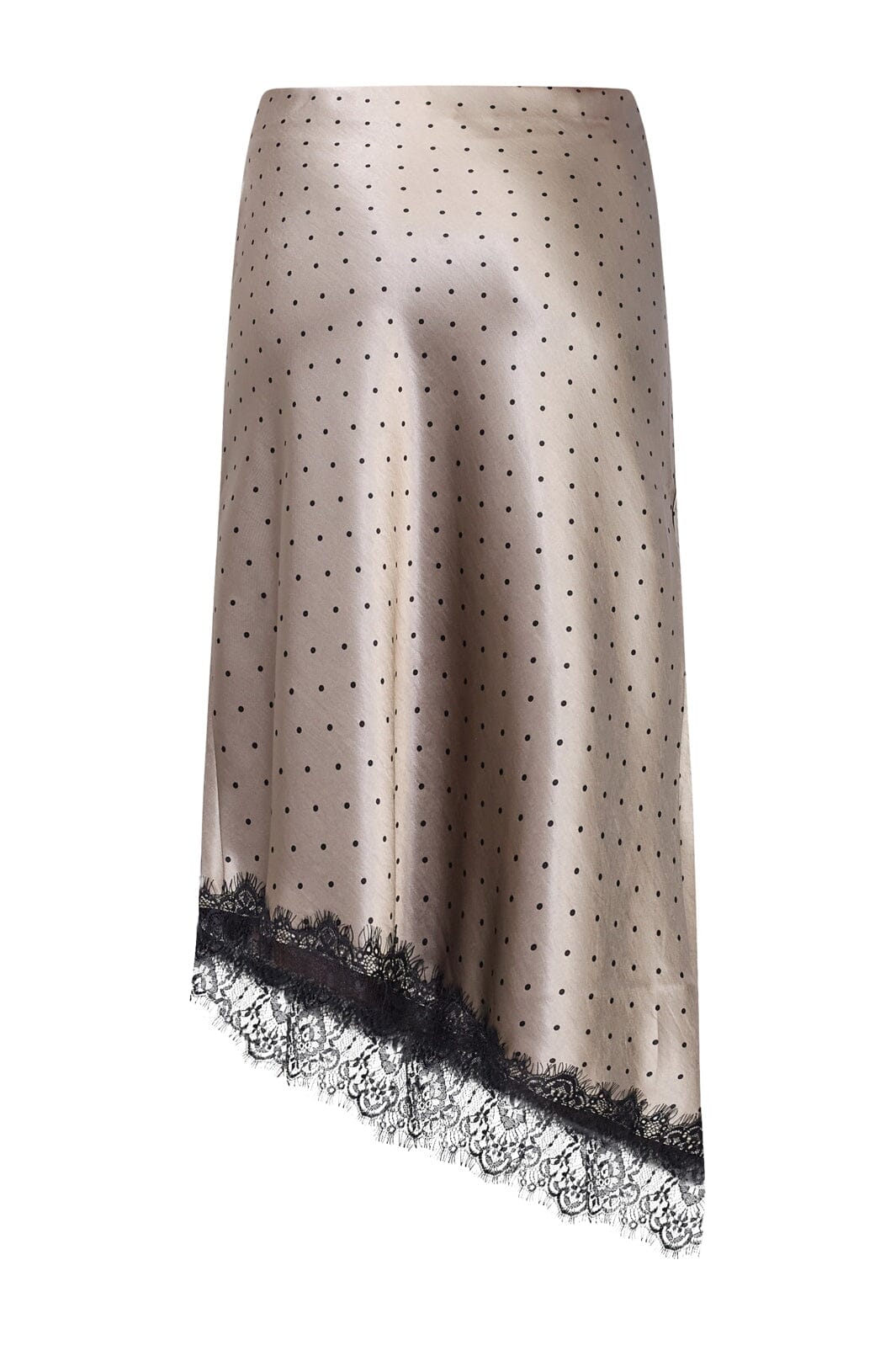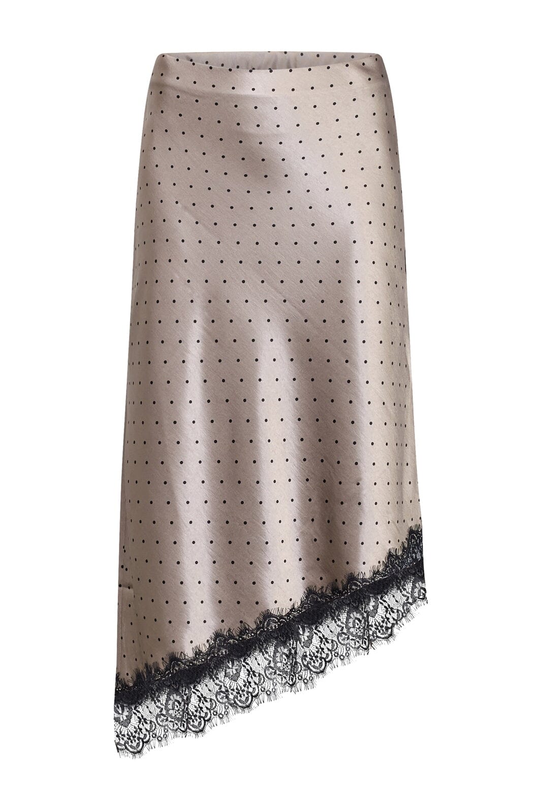 Beige nederdel fra Sisters Point med polka-dot mønster og sort blondekant. Nederdelen har en skinnende overflade og et asymmetrisk snit.
