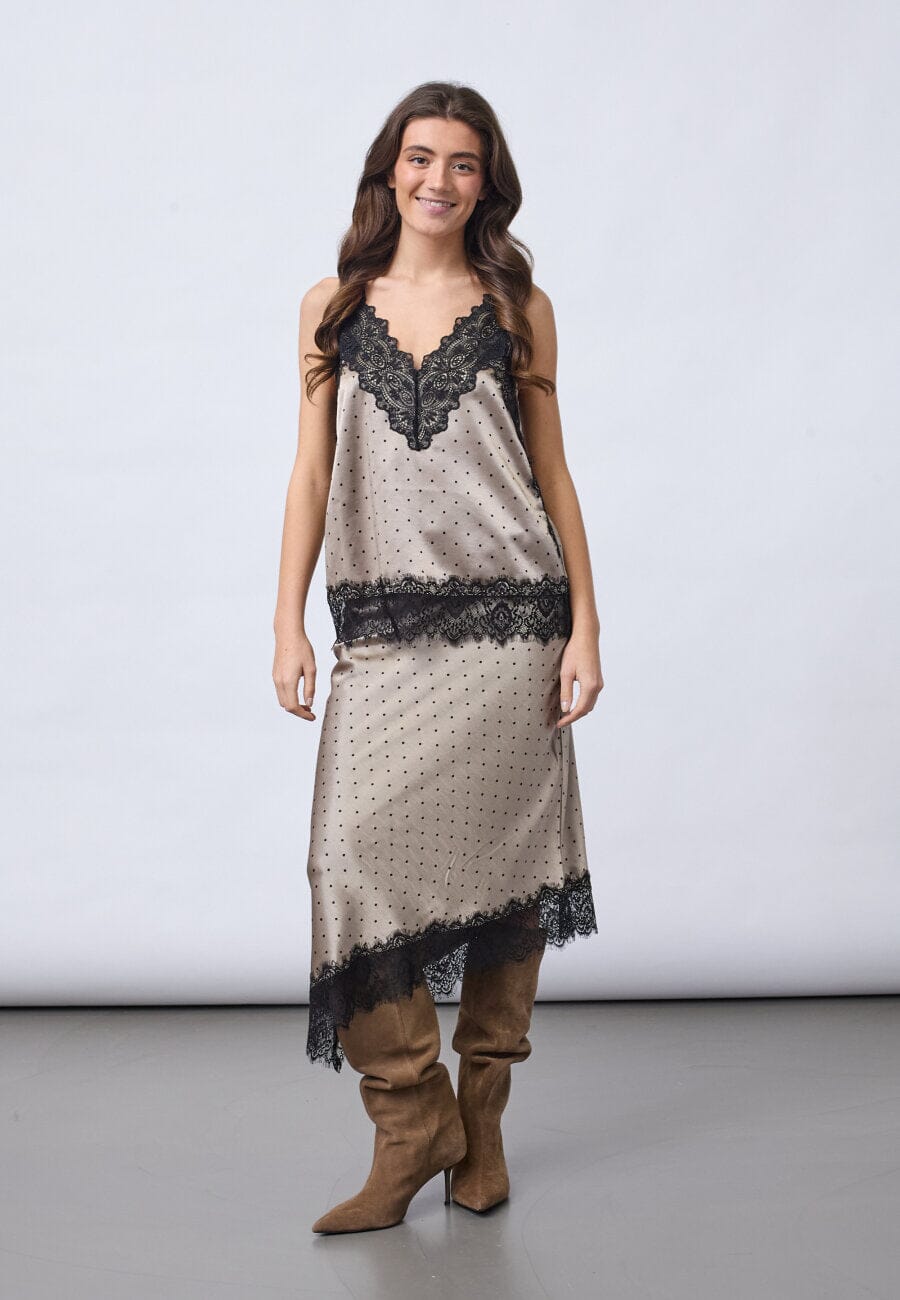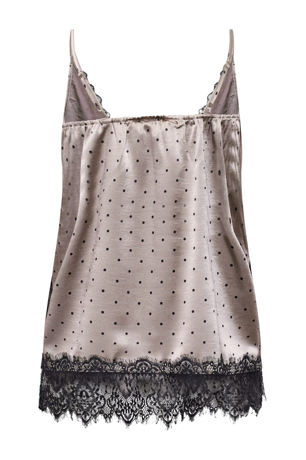 Top fra Sisters Point i beige med sorte polkaprikker. Toppen har tynde stropper og blondekanter ved V-udskæringen og i bunden.