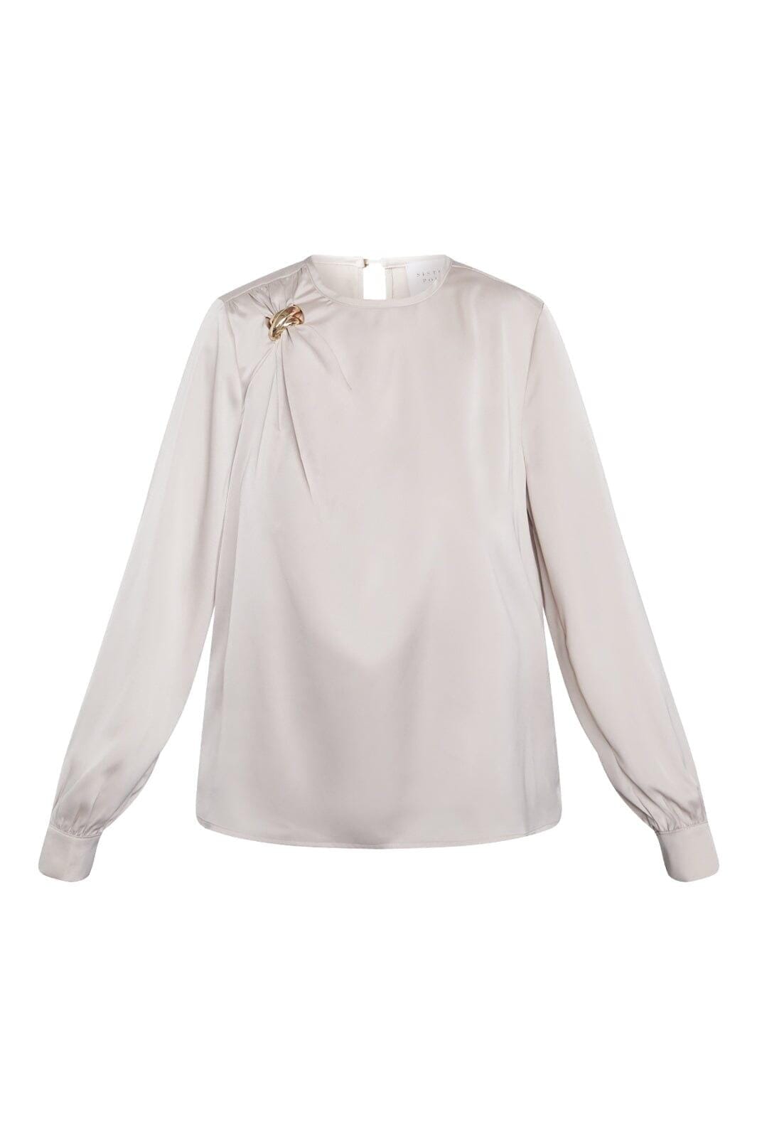 En lys cremefarvet bluse fra Sisters Point med lange ærmer og et guldfarvet metalspænde på skulderen.