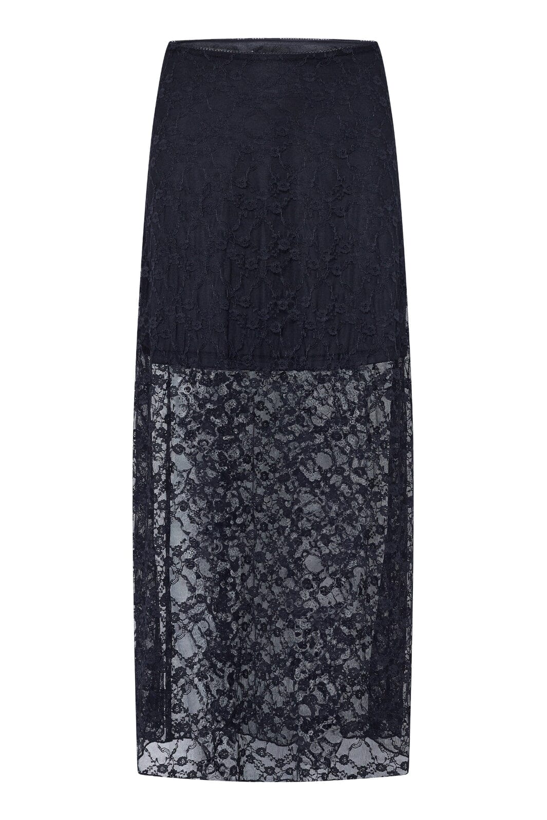 Sort nederdel fra Sisters Point med blomstret blondemønster. Den øverste del er tætsiddende og uigennemsigtig, mens den nederste del har et gennemsigtigt blondelag fra knæet og ned.