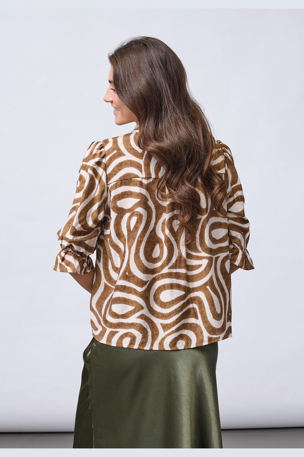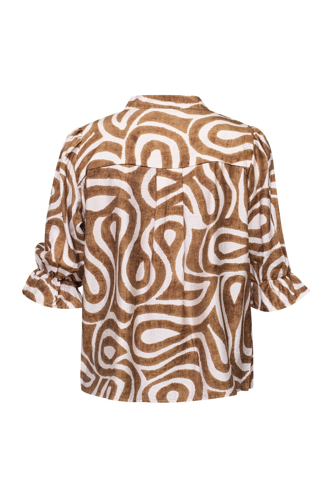 Bluse fra Sisters Point med brunt og beige etnisk hvirvelmønster. Blusen har en V-udskæring med kinakrave og trekvartærmer med flæser.