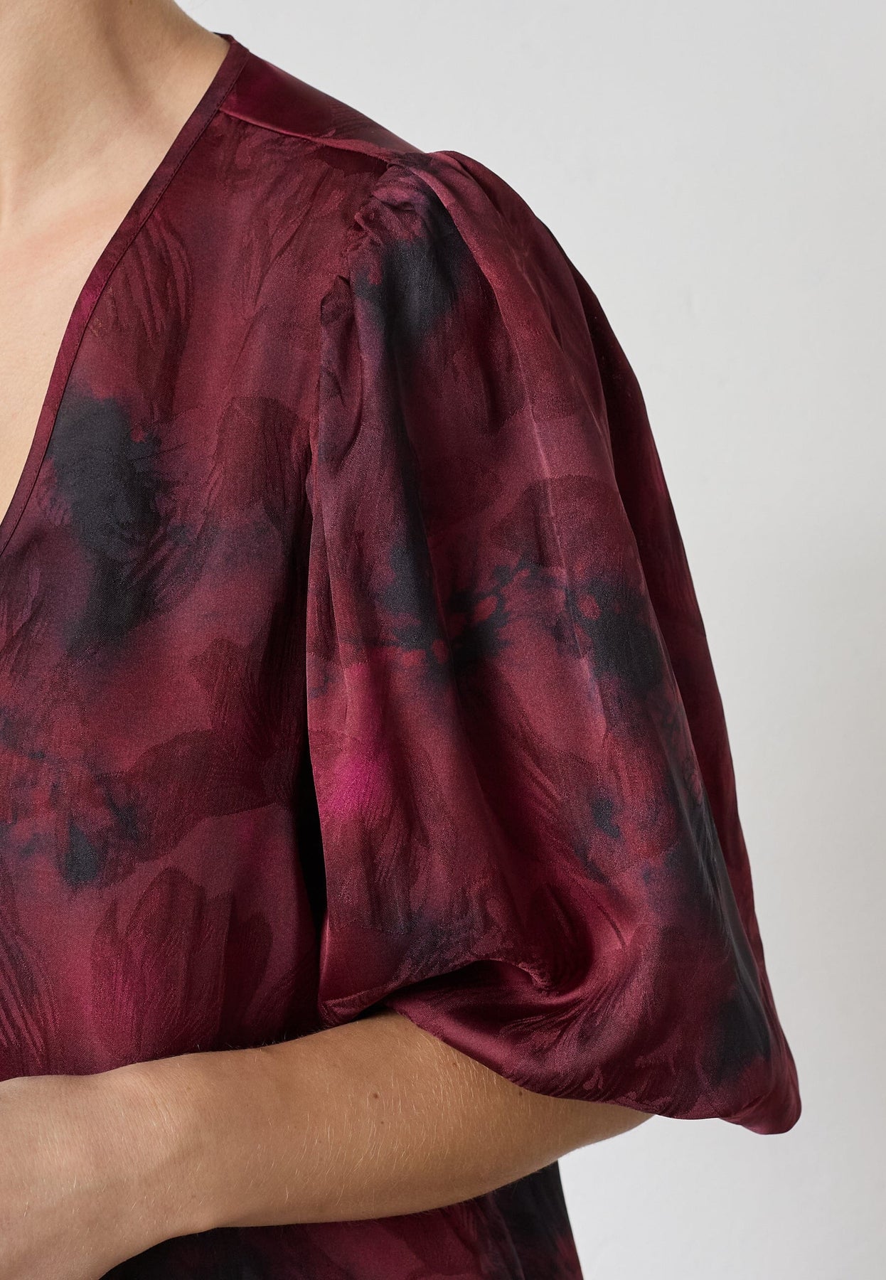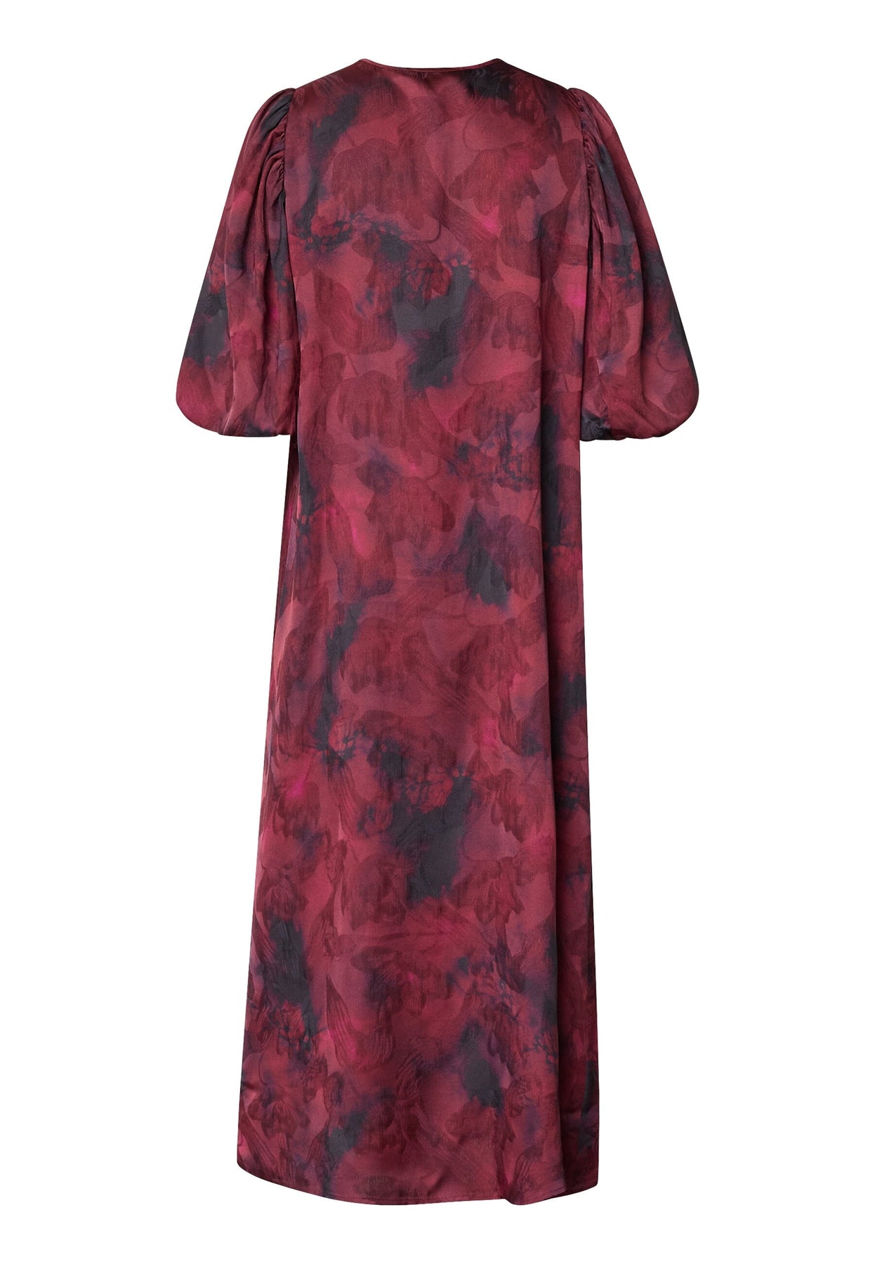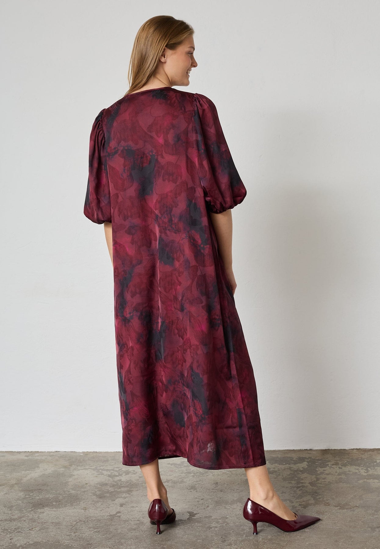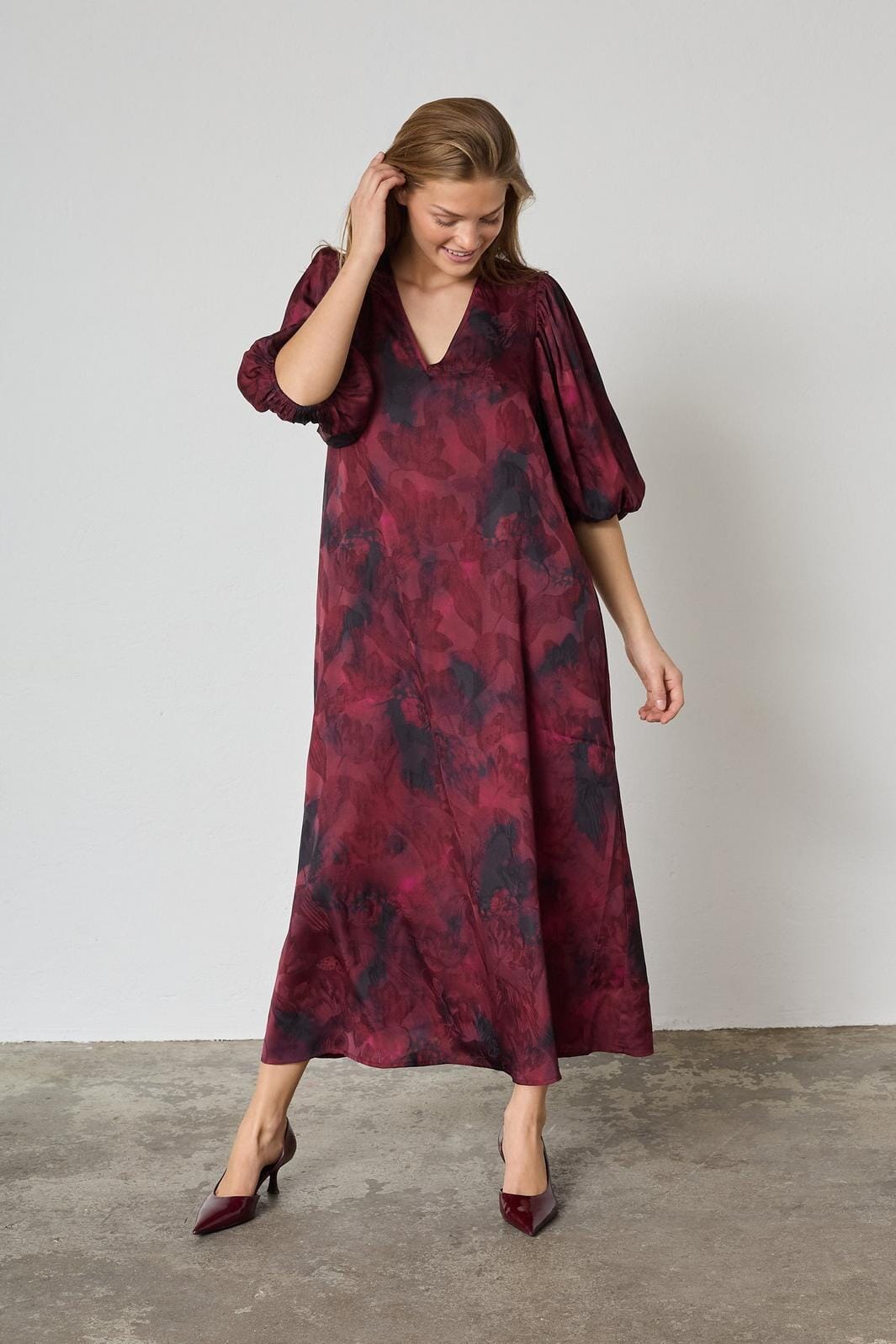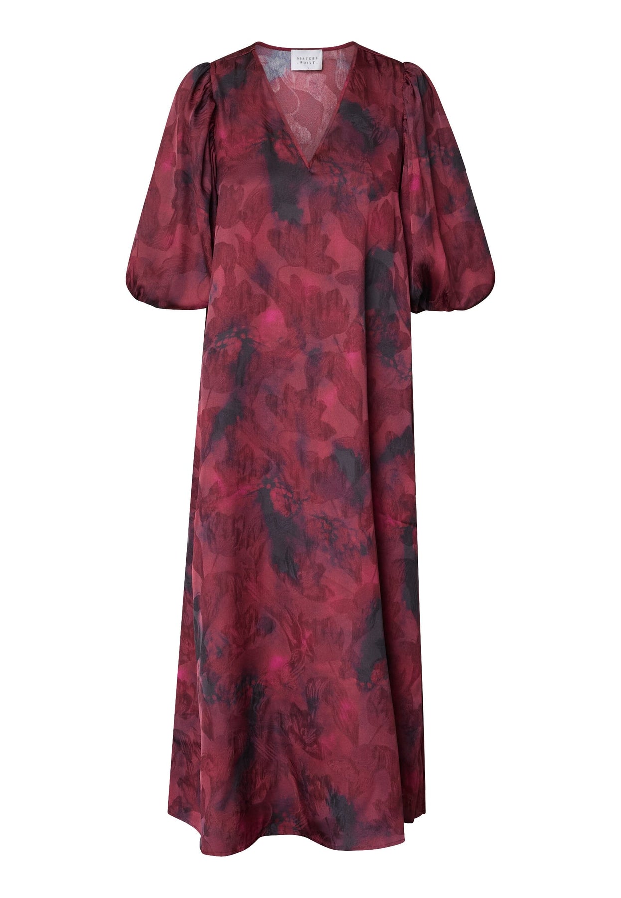 Kjole fra Sisters Point i bordeaux med et sløret, flerfarvet print. Kjolen har en V-hals og trekvartlange pufærmer med elastik forneden.