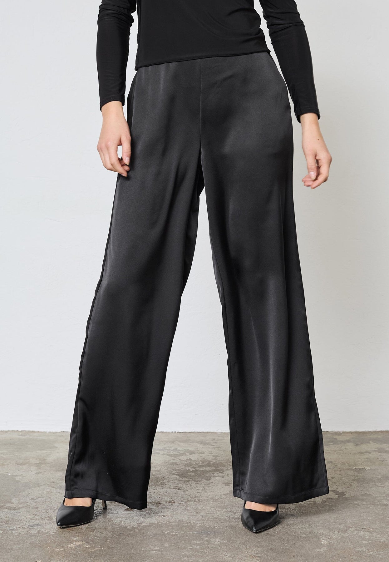 Sorte bukser fra Sisters Point i satinlignende stof. Bukserne har en gulvlang længde og er velegnede til både festlige og formelle lejligheder.
