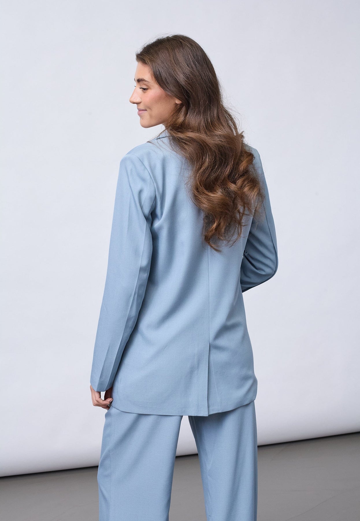 Lyseblå blazer fra Sisters Point med klassisk reverskrave og knaplukning foran. Blazeren har to lommer foran og tre pynteknapper på hver ærme.