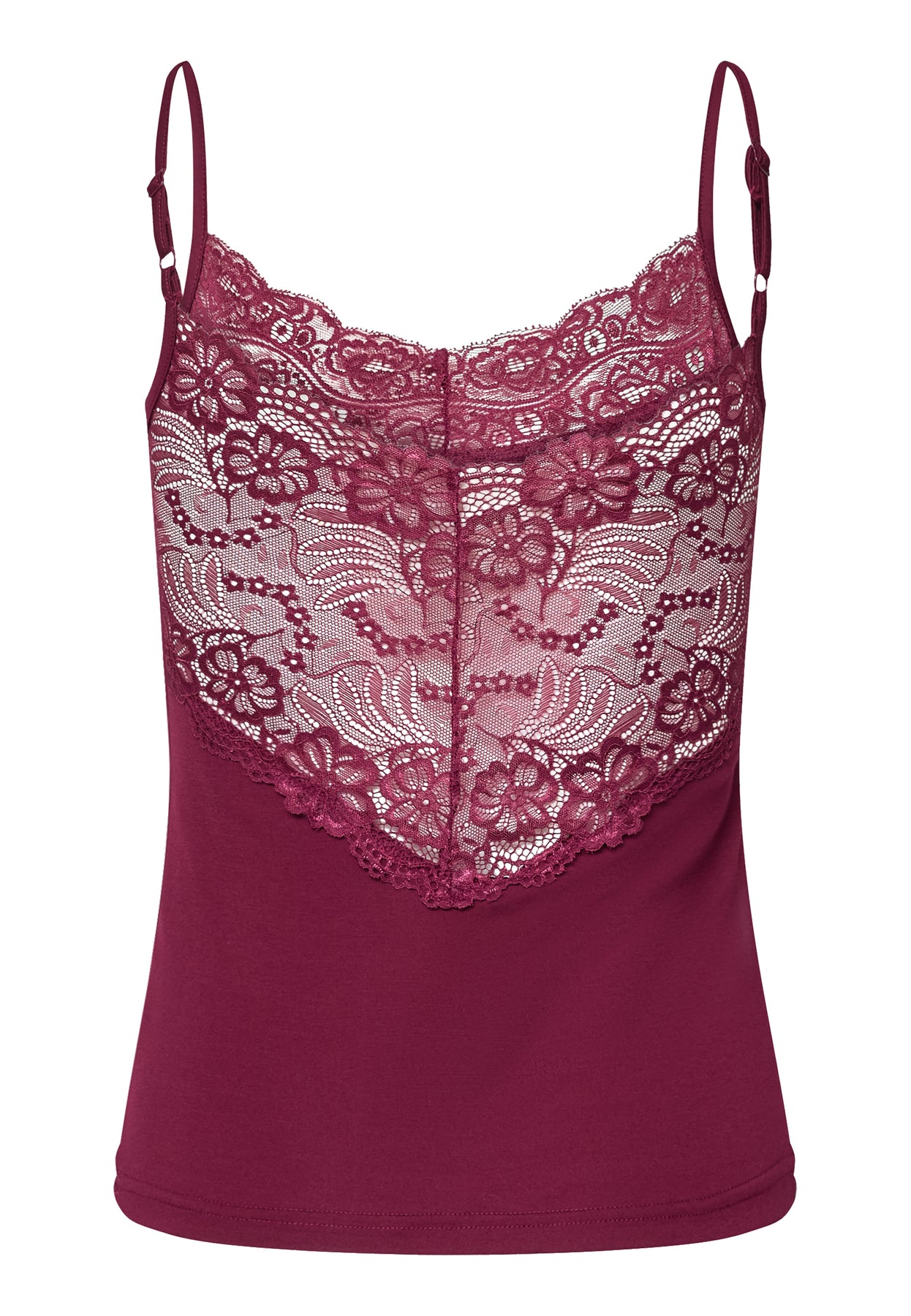 er en basis top med en tætsiddende pasform og blondedetalje på for- og bagside. Fås i flere farver. Modellen har en str. S på