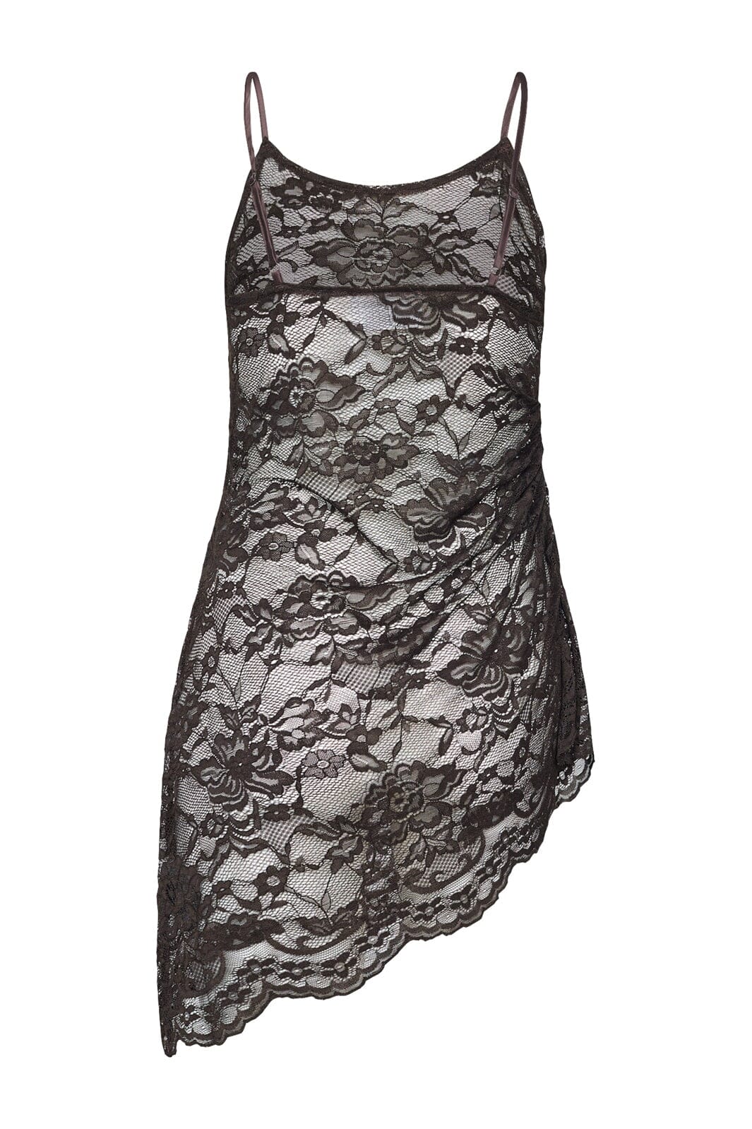 Blondekjole fra Sisters Point i en dyb brun nuance. Kjolen er gennemsigtig og har et heldækkende blomstret blondemønster.