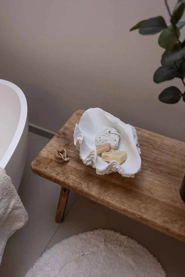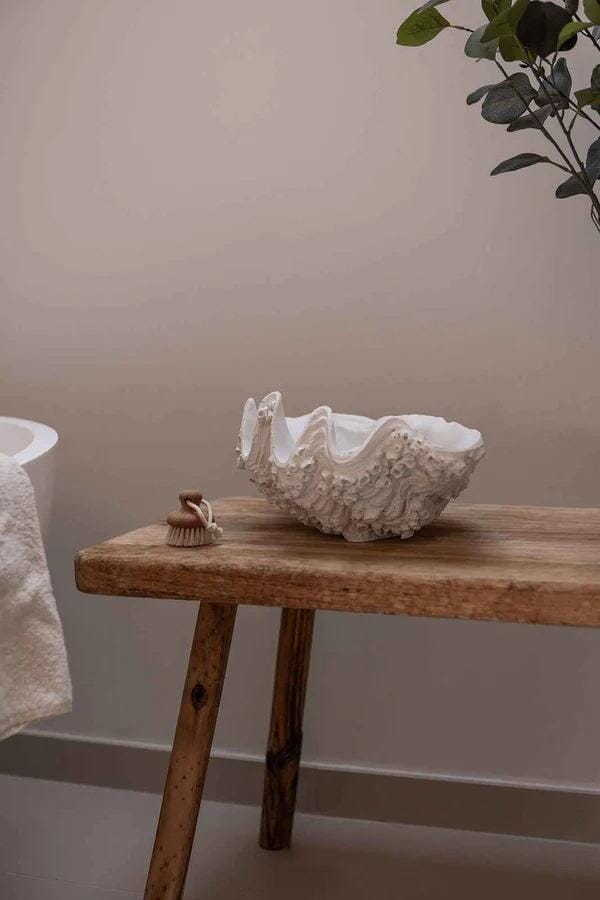 Hvid skål fra Specktrum med muslingeskalform. Den har en overflade med naturlige mønstre og en glat, blank inderside. Skålen kombinerer dekorativ stil med praktisk funktion.