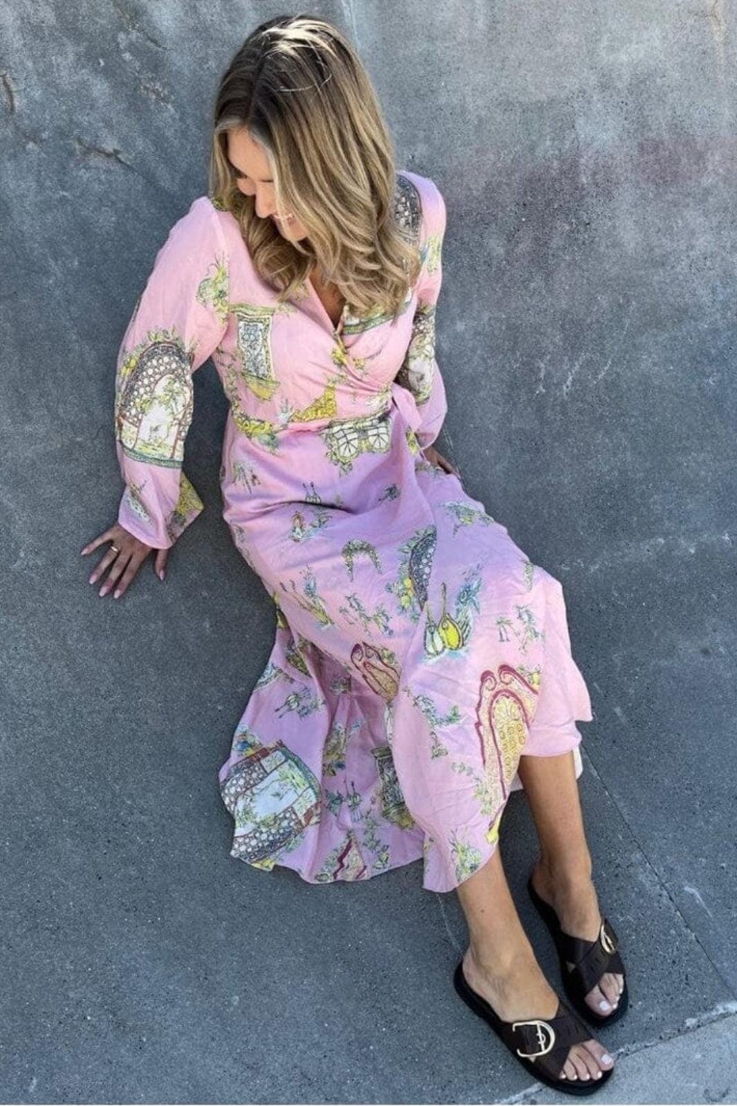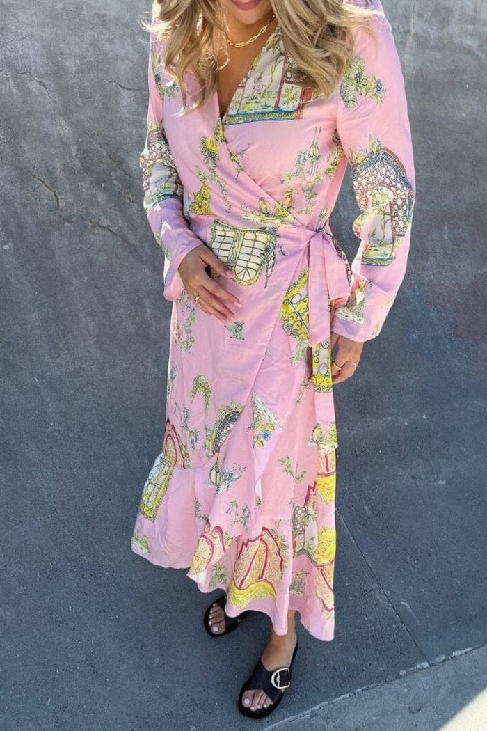 Lyserød kjole fra Stories From The Atelier by Copenhagen Shoes, lavet af viskose med et pastelprint i flere farver. Kjolen har lange ærmer og en V-hals.