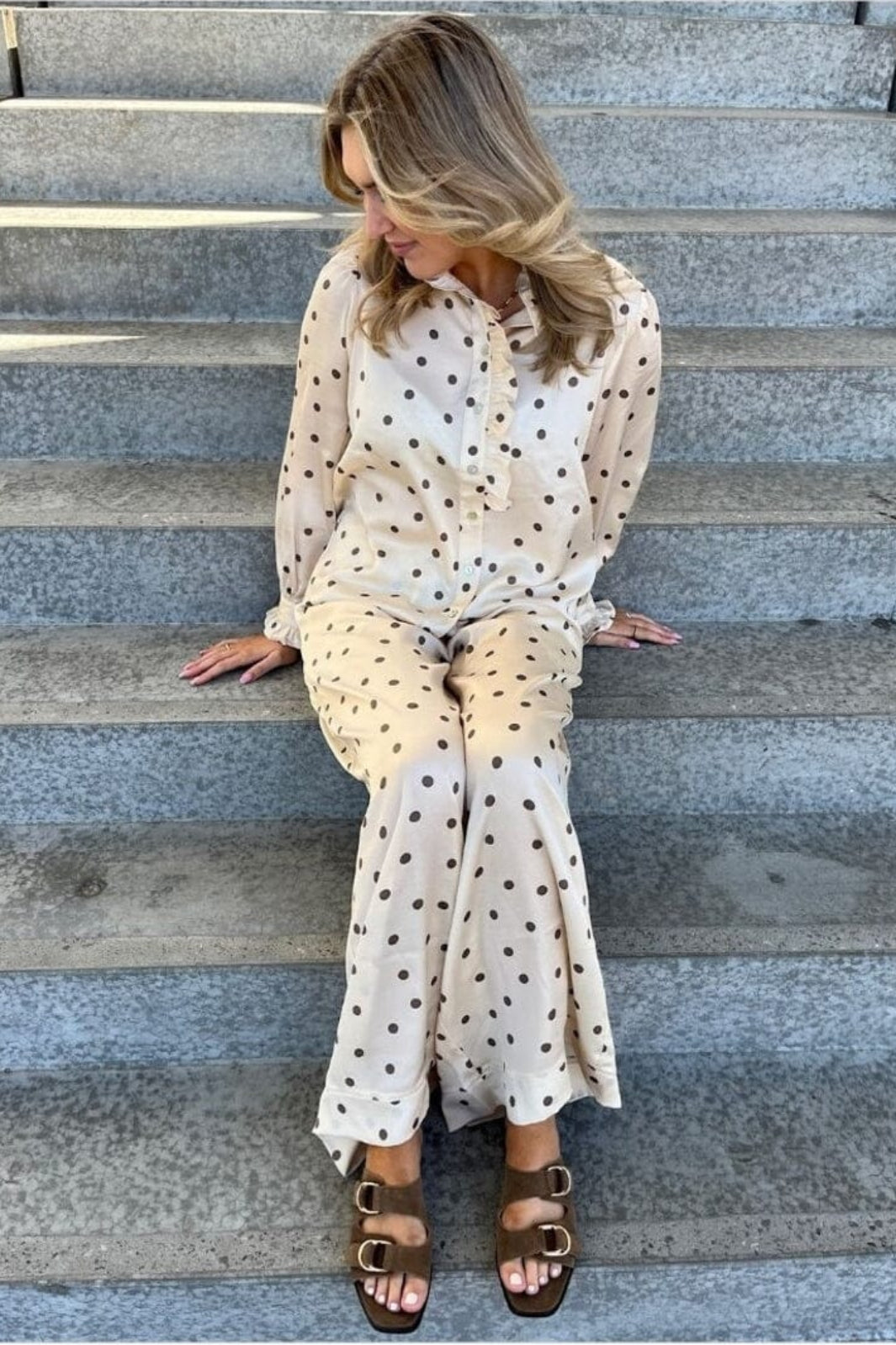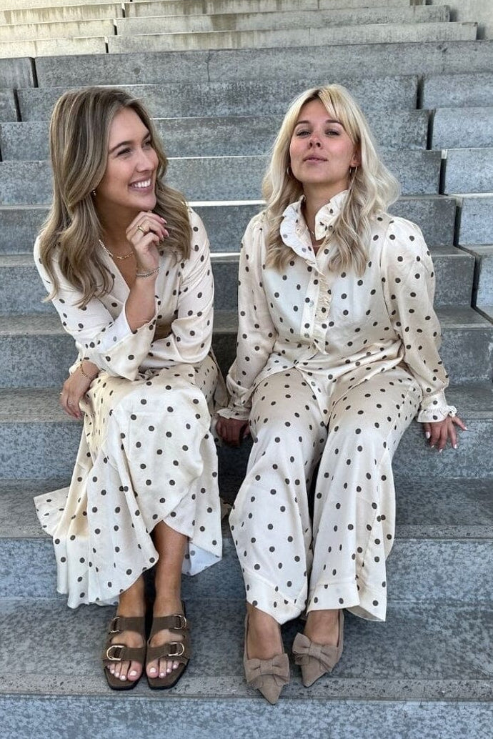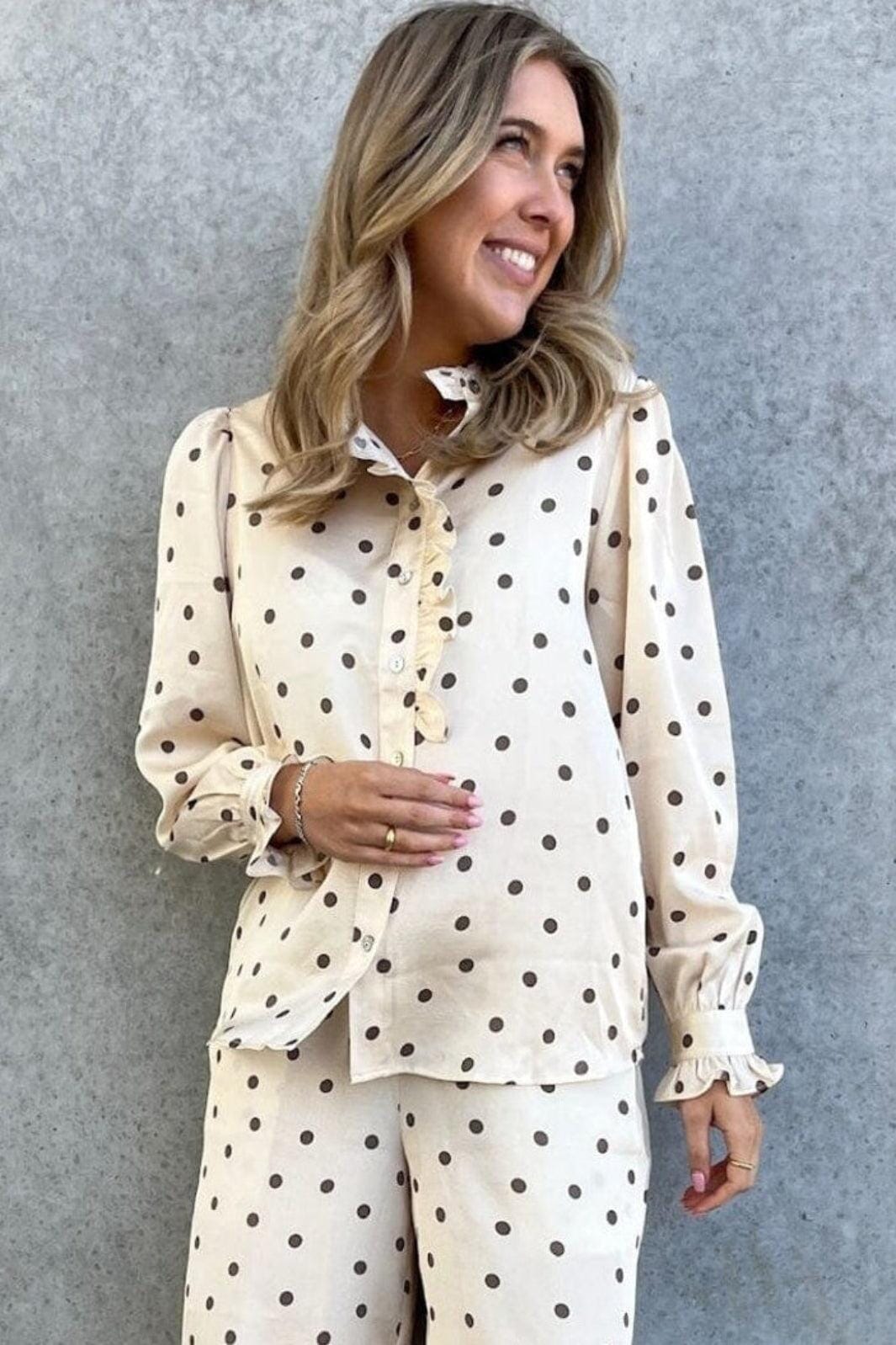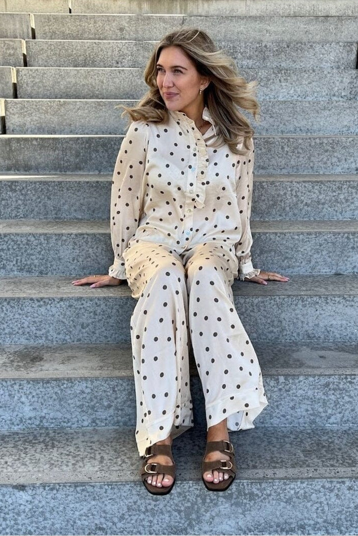 En off-white skjorte med brune polkaprikker fra Stories From The Atelier by Copenhagen Shoes. Skjorten har flæsedetaljer ved kraven og knaplukning foran.