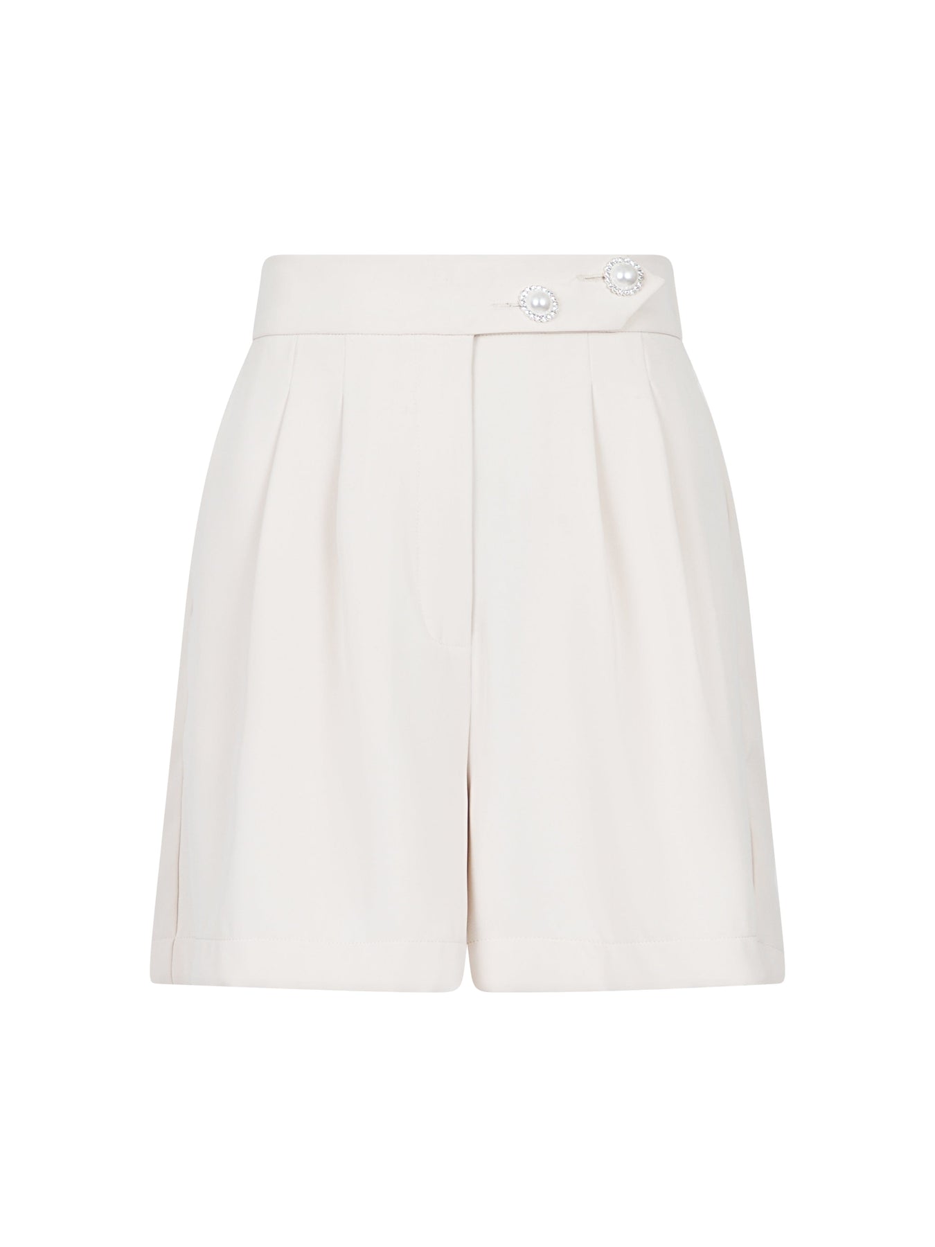 Højtaljede shorts fra Valentin Studio i ivory. Shortsene har en løs pasform med pynteknapper og perledetaljer, der giver et dekorativt præg.