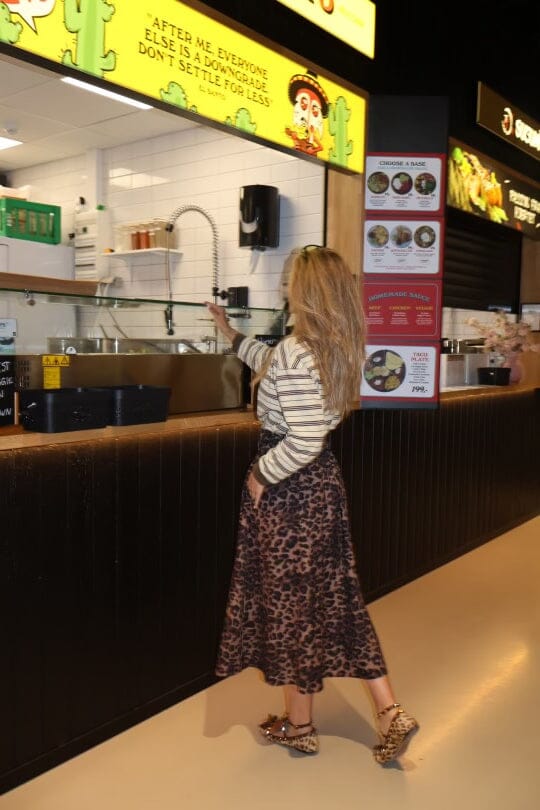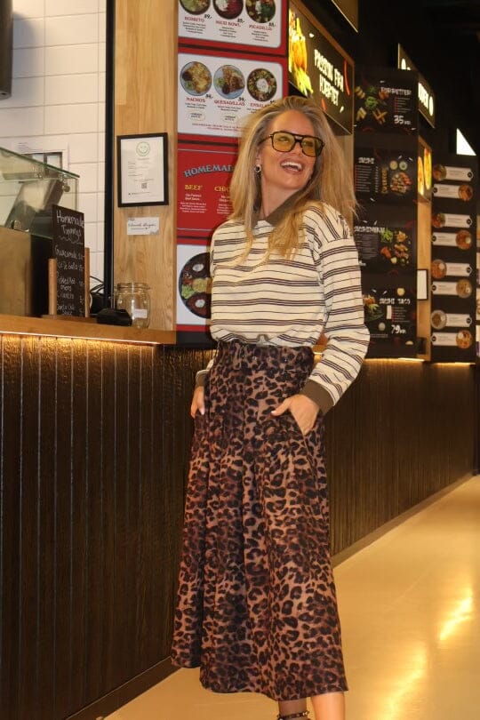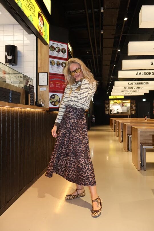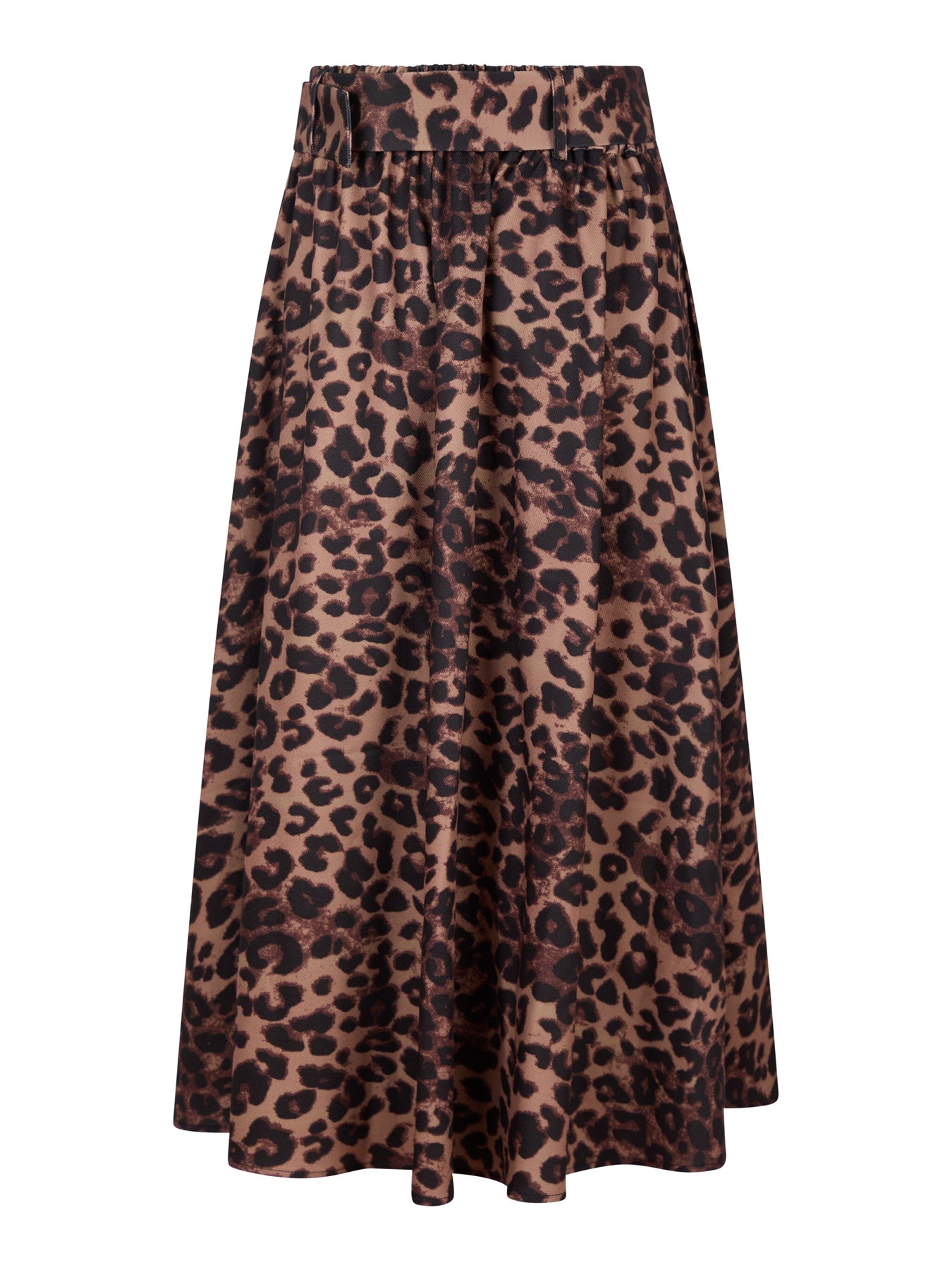 Plisseret nederdel fra Valentin Studio med brunt leopardmønster. Nederdelen har en høj talje og går til midt på læggen med et blødt fald i stoffet.
