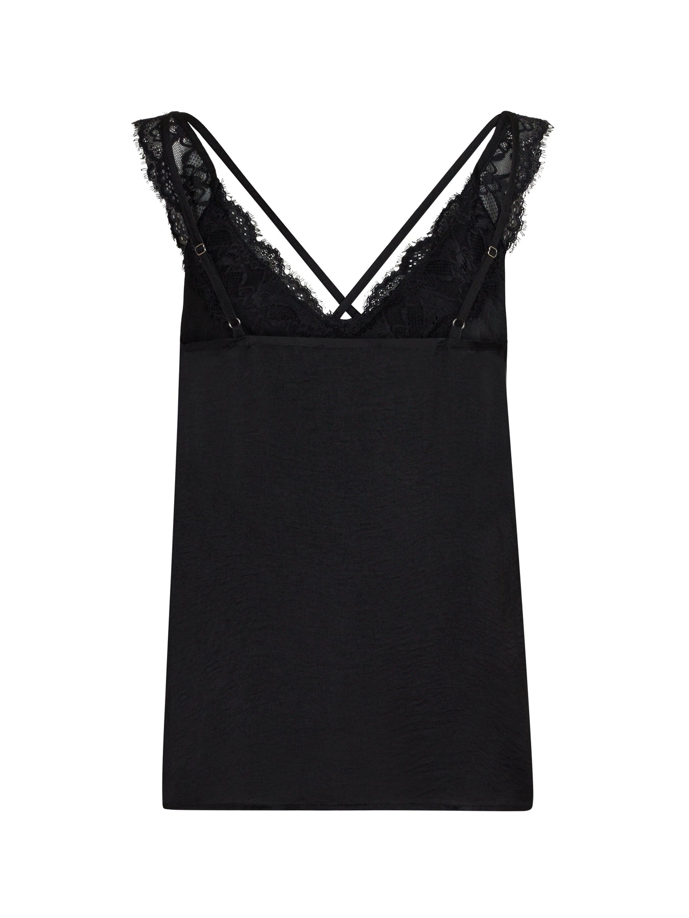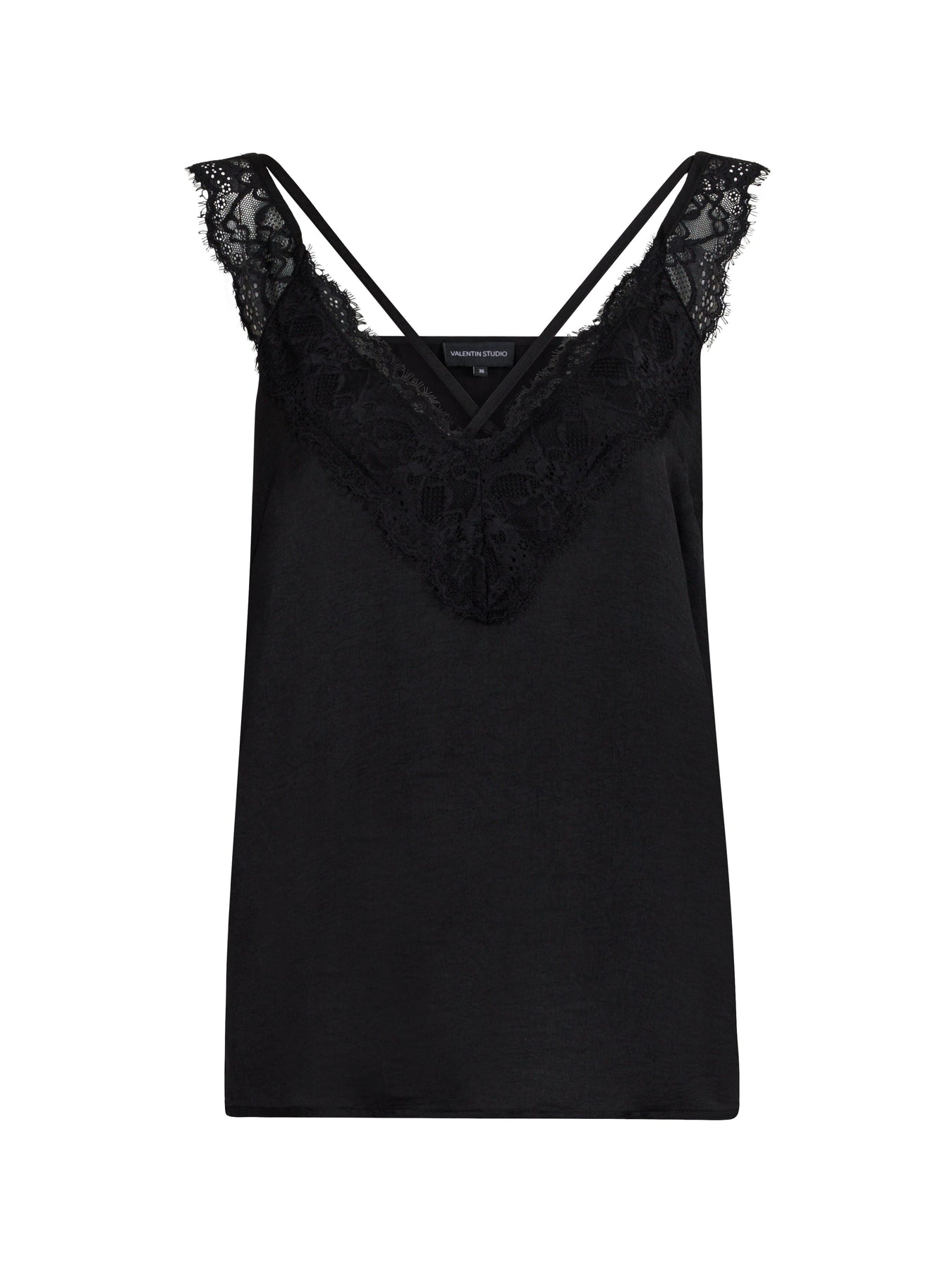 Sort stringtop fra Valentin Studio med tynde stropper og blondedetaljer. V-udskæringen og den løse pasform gør toppen nem at style til forskellige anledninger.