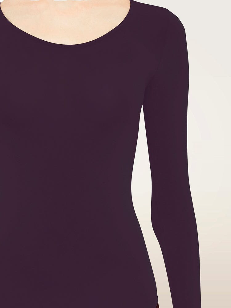 Dyb lilla body fra Wolford med lange ærmer og rund halsudskæring. Bodyen har en tætsiddende pasform og passer til både formelle og afslappede lejligheder.