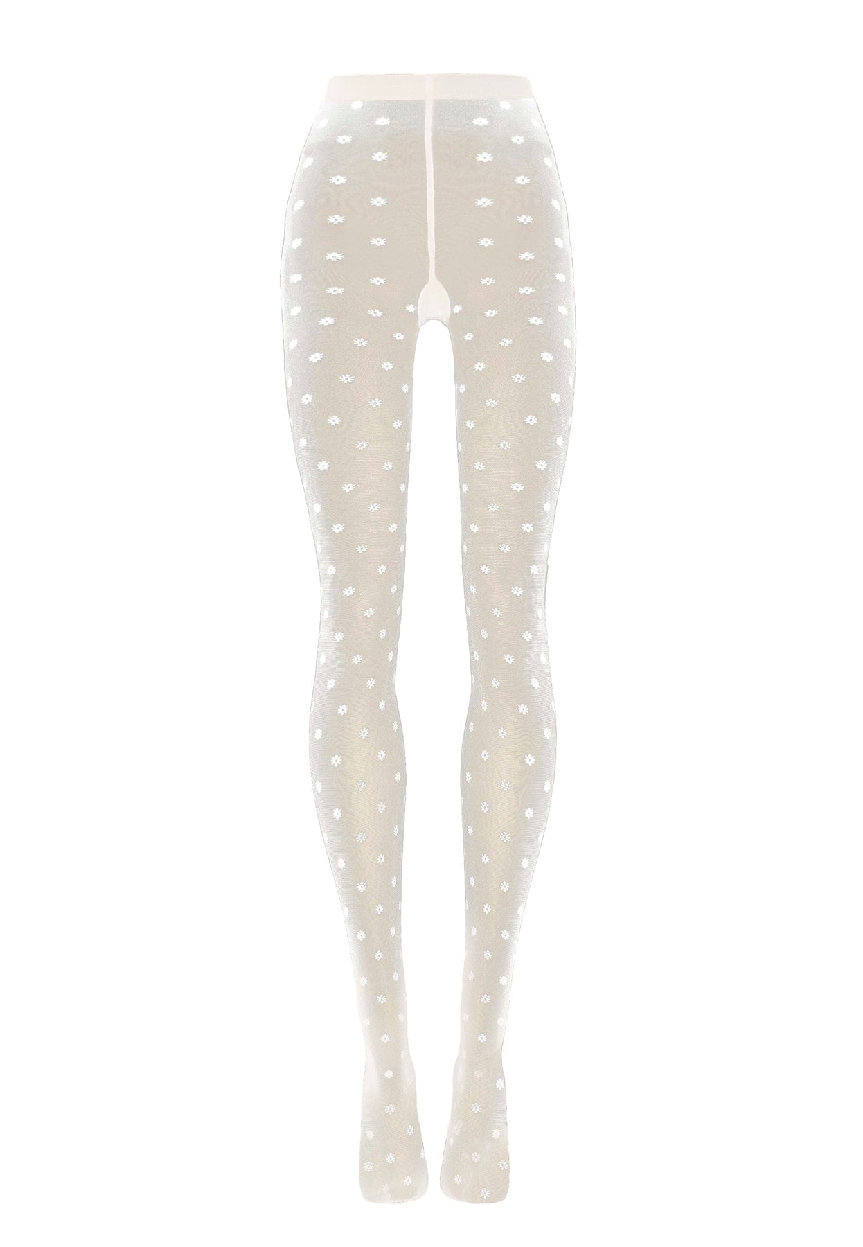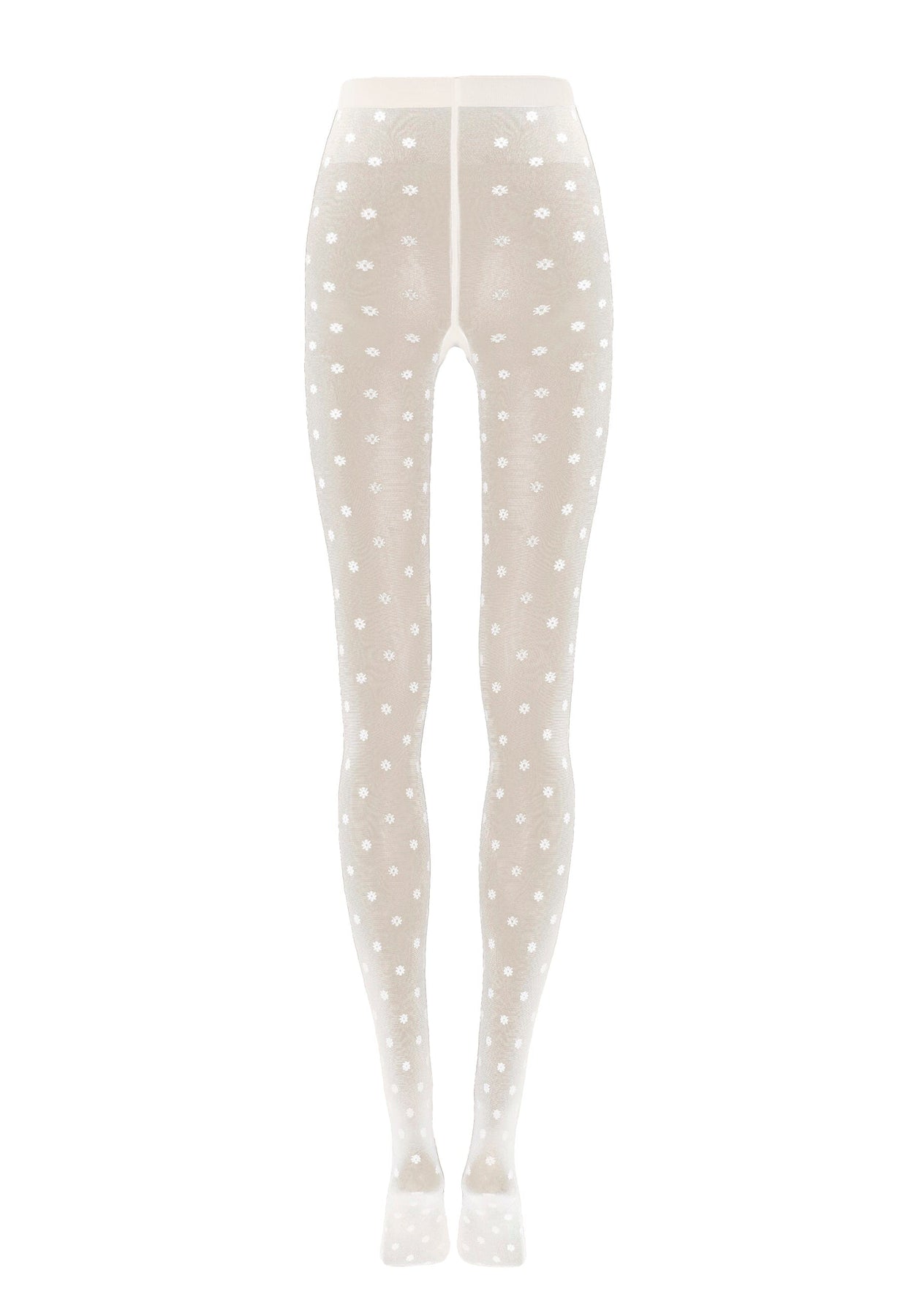 Hvide strømpebukser fra Wolford med et mønster af små blomster. Strømpebukserne har et elastisk taljebånd og dækker hele benet fra talje til tæer.