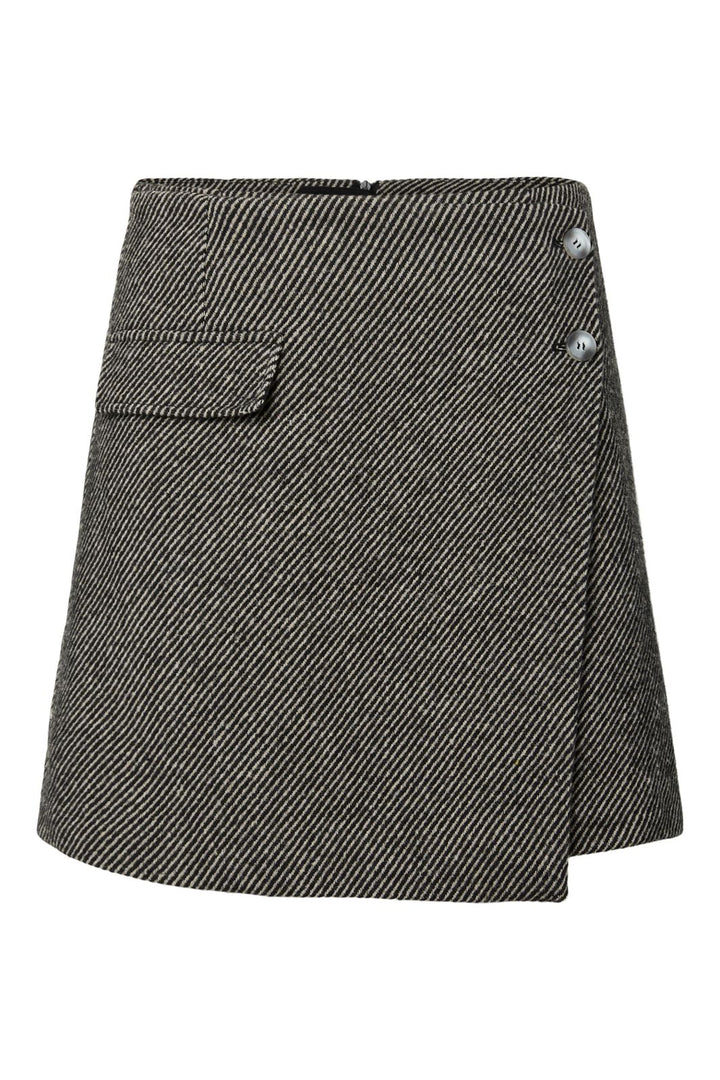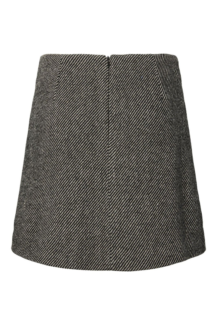 Sort nederdel fra Y. A.S med diagonale striber. Den har høj talje og en flaplomme på forsiden med to knapper på højre side.