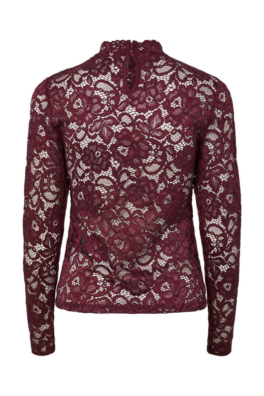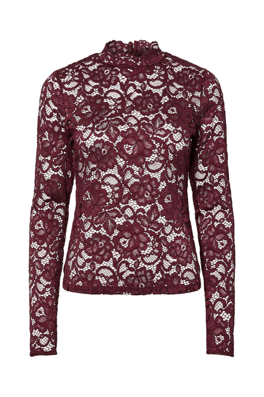 Blondetop fra Y. A.S i bordeauxrød med høj hals og lange ærmer. Toppen har et blomstret blondemønster, flæsedetaljer samt knaplukning i nakken.
