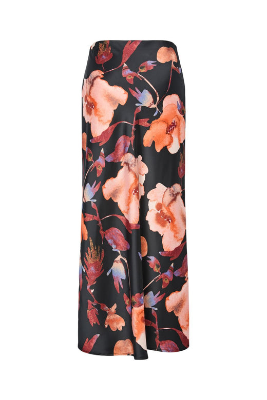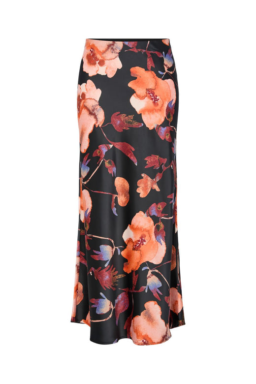 Sort maxi-nederdel fra Y. A.S med blomstermønster i orange, rød og blå nuancer på sort baggrund. Nederdelen har en høj talje og går ned til gulvet.