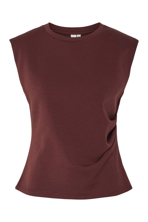 Ærmeløs top fra Y. A.S i en dyb bordeauxrød nuance. Toppen har en rund halsudskæring og rynker på forsiden, der skaber tekstur i stoffet.