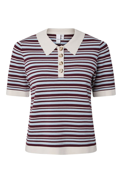 YAS - Yasbelle Ss Polo Knit Pullover - 5115833 Birch Burgundy/Blue Stripe