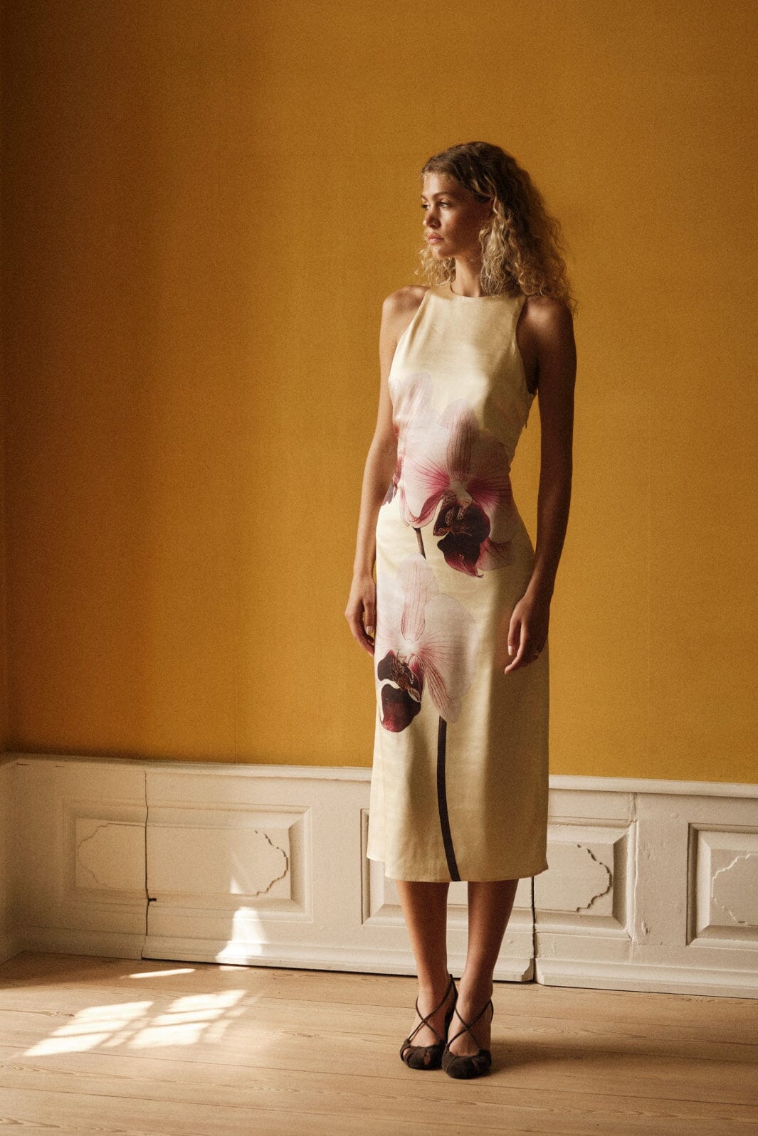 Lang satinkjole fra YAS i lys gul farve med et stort orkidéblomstermønster i lyserøde og mørkerøde nuancer.