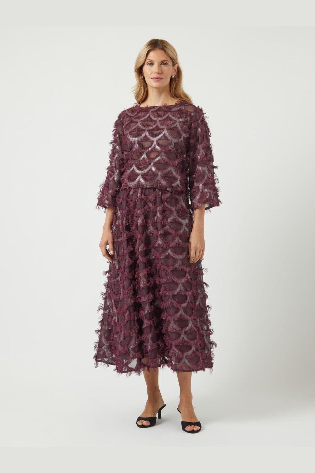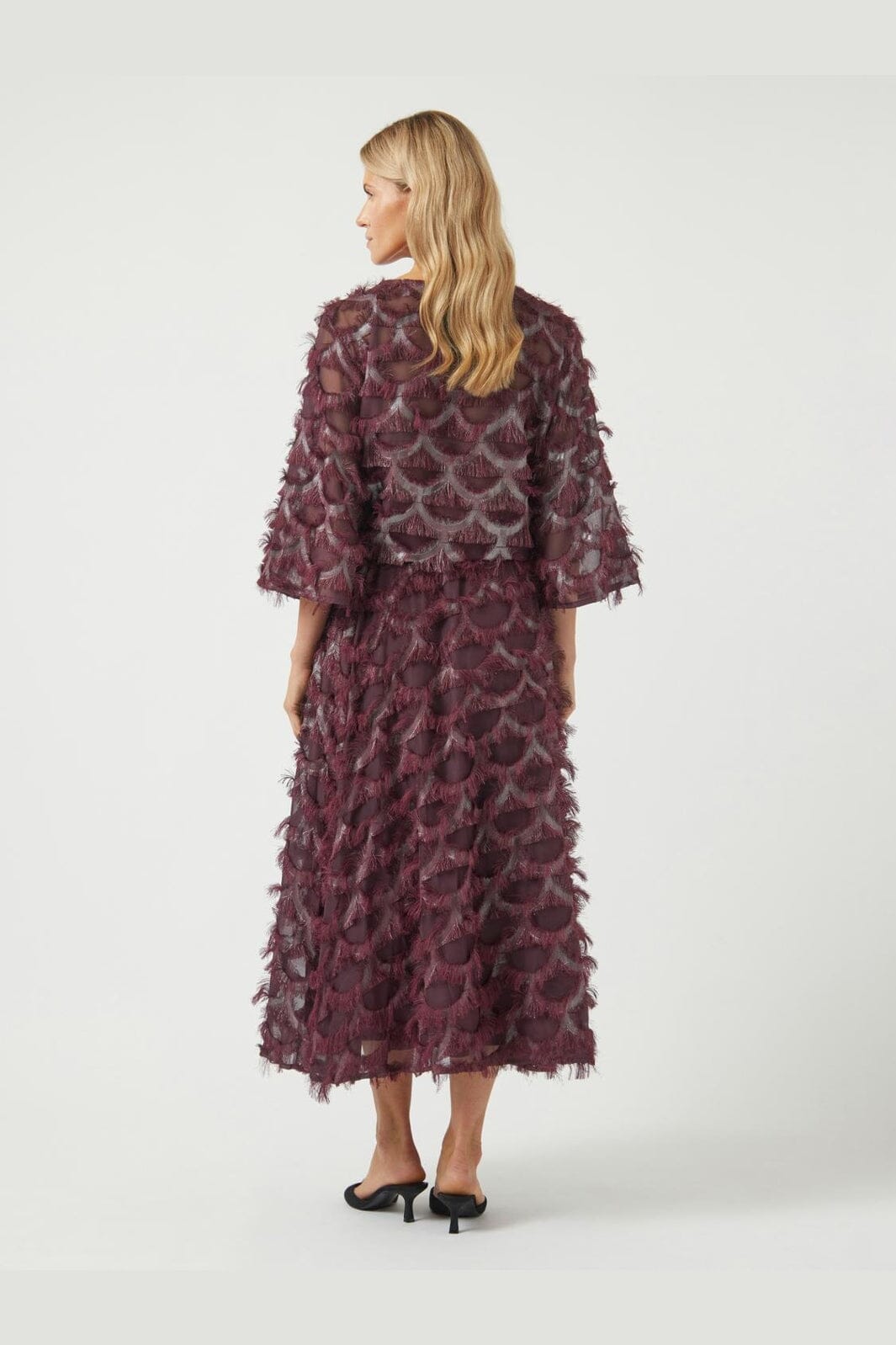 Nederdel fra YAS, lavet af 100 % polyester i en dyb burgunder-rød nuance med metallisk print og frynser over hele overfladen.